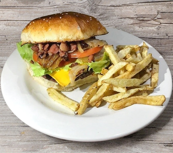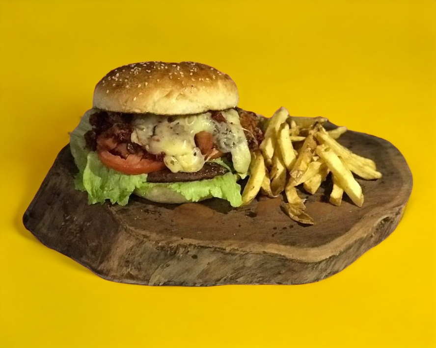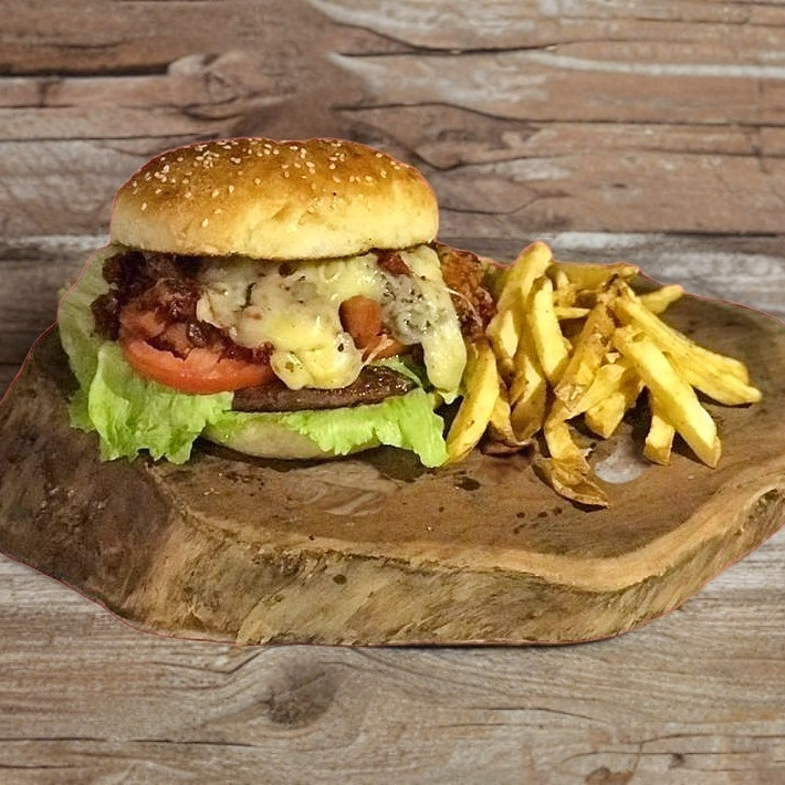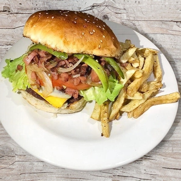 Carne de res, queso amarillo, lechuga, tomate, tocino acompañado con papas.