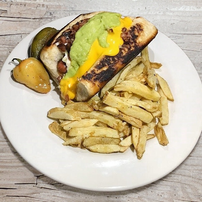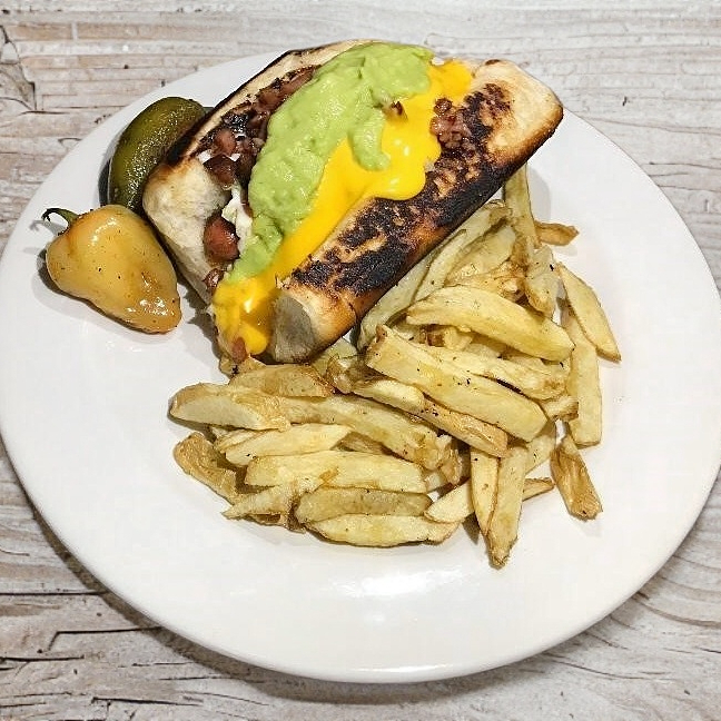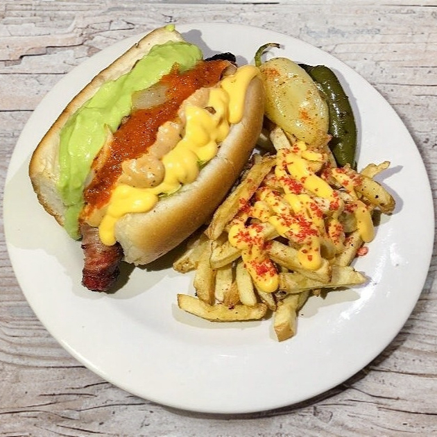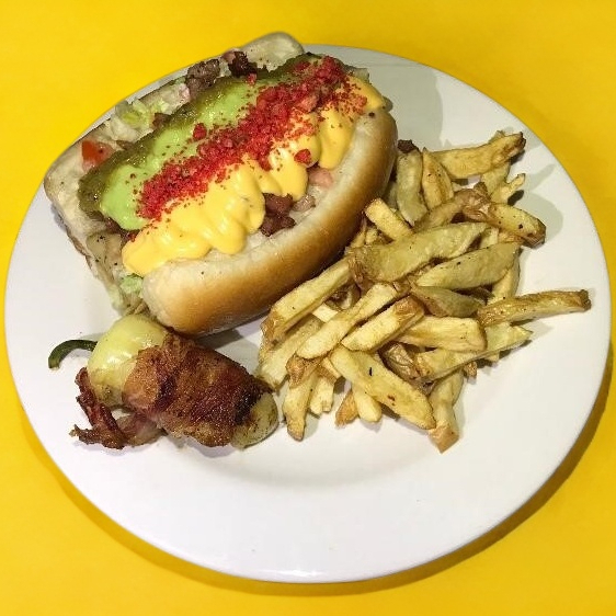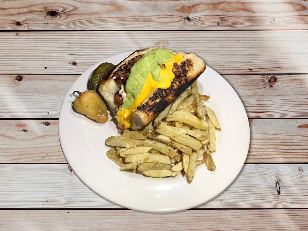 Pan dorado con queso chihuahua y queso amarillo dentro, doble salchicha, lechuga, tomate, chorizo, frijol, cebolla asada, mayonesa y chile verde incluye papas.