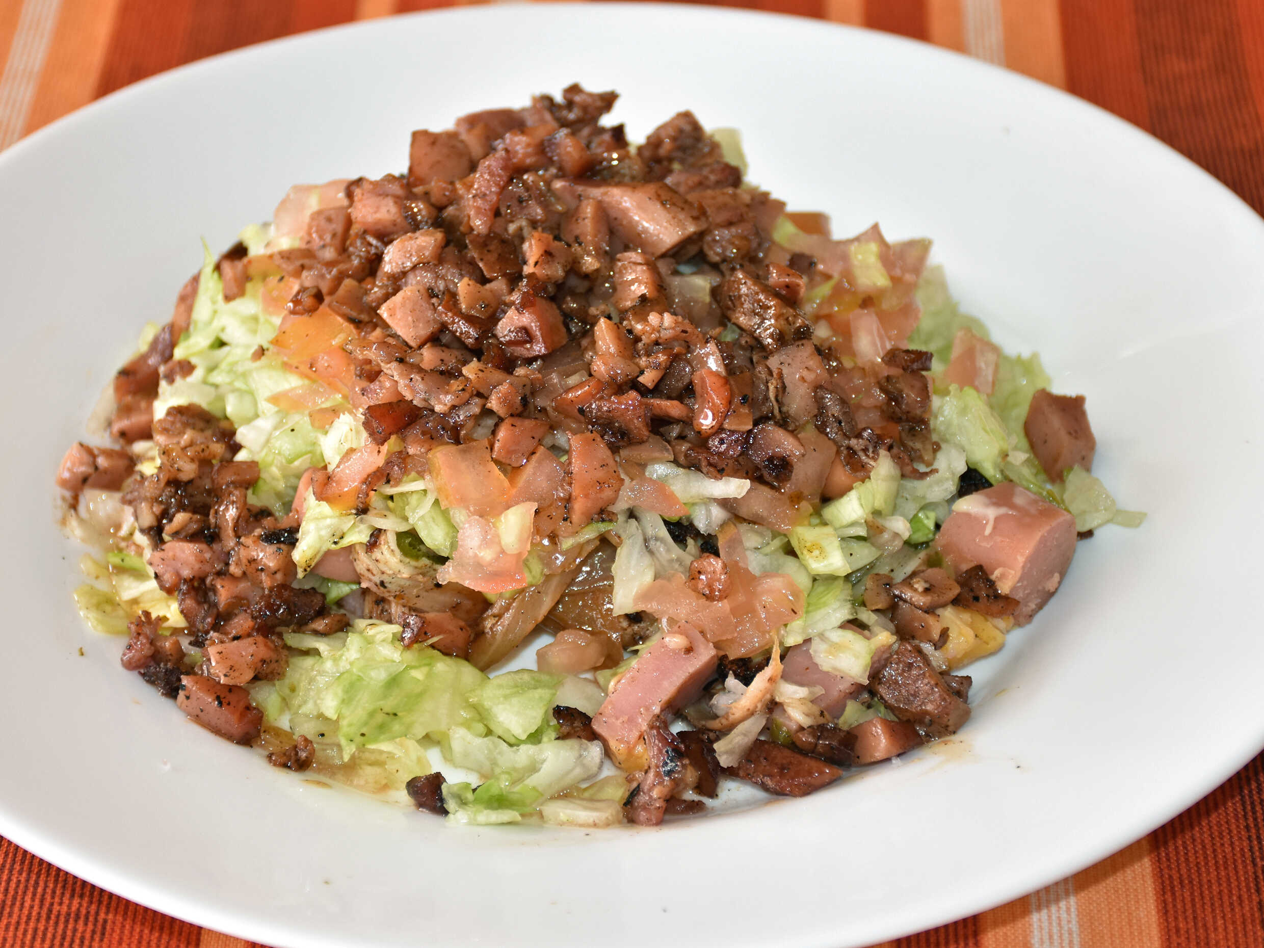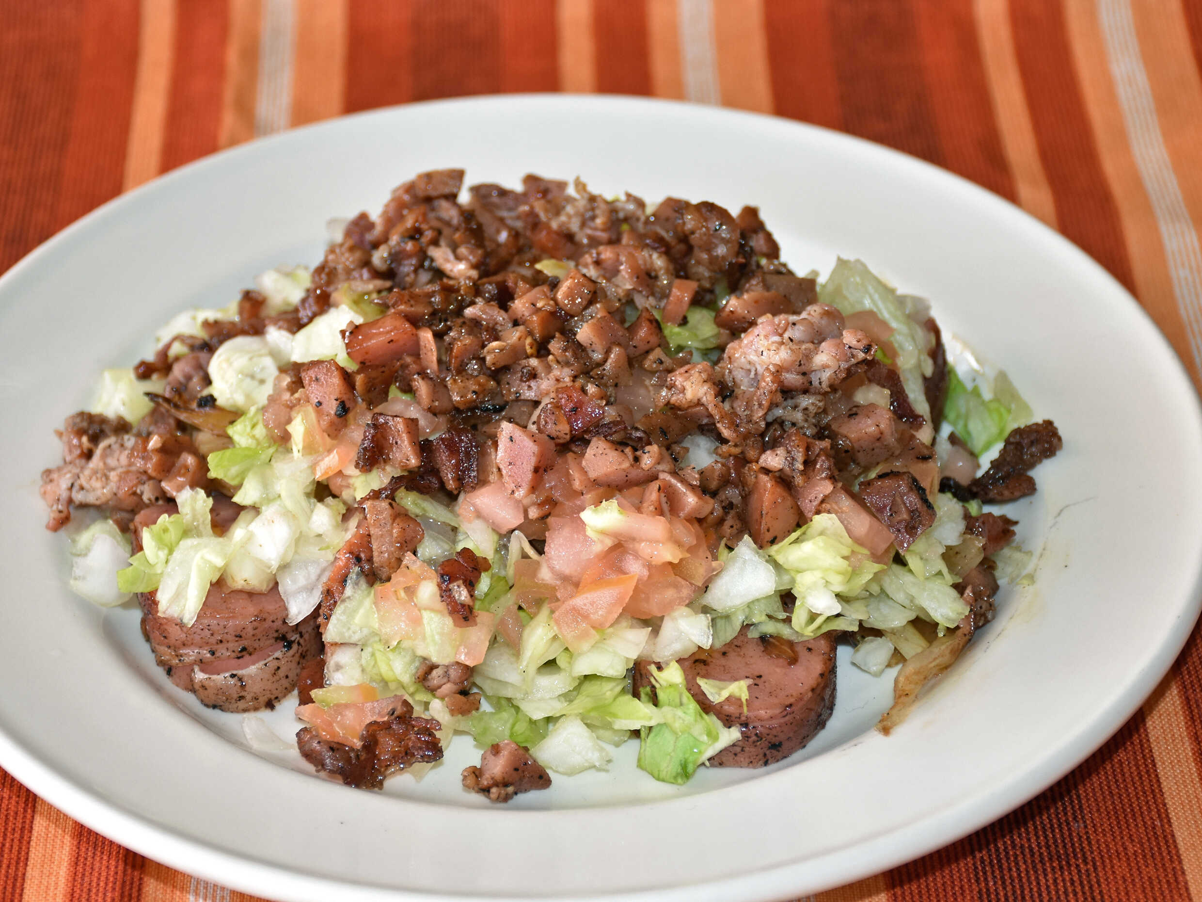 Una momia picada, lechuga, tomate, cebolla asada, chorizo y frijoles.