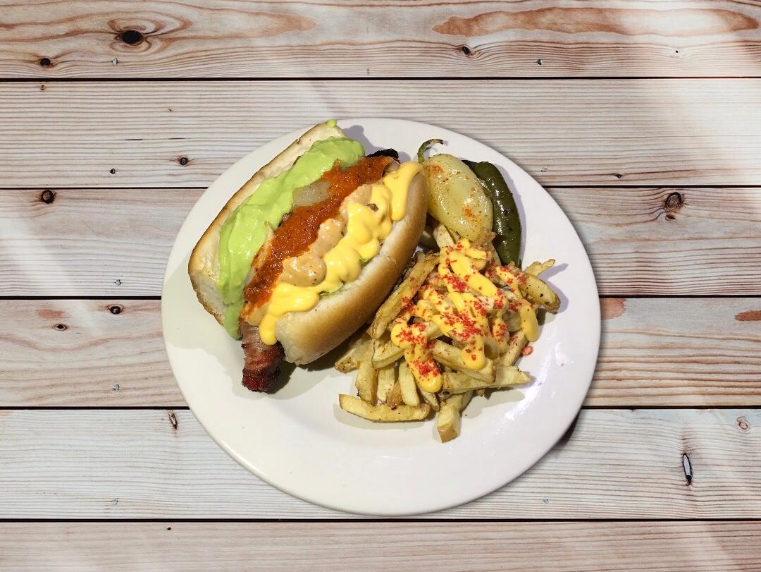 Salchicha jumbo, lechuga, tomate, cebolla asada, chorizo frijol y mayonesa.