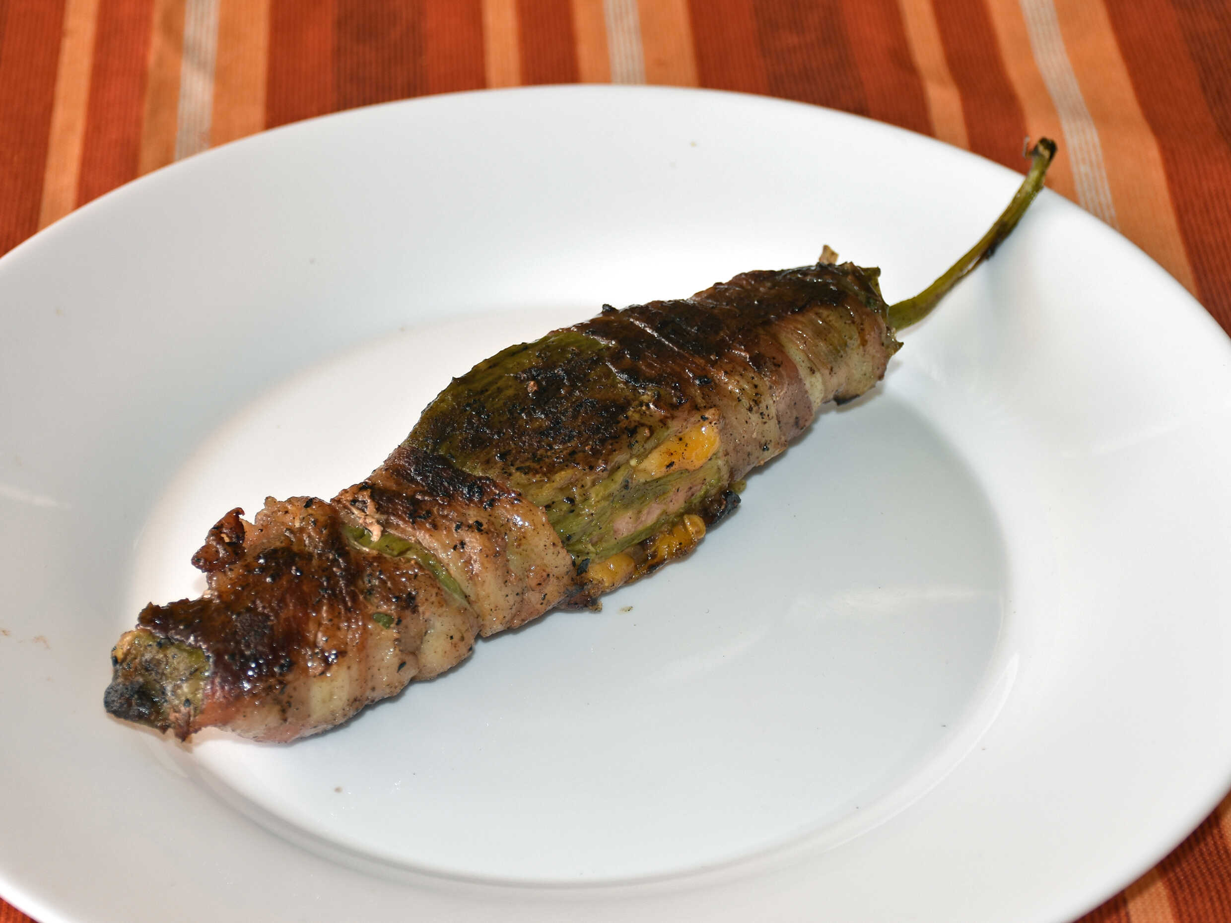 Chile relleno de salchicha rosarito, queso chihuahua y amarillo, jamón y envuelto en tocino.