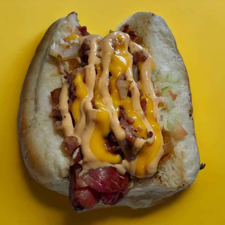 Salchichas de pavo jumbo rellena de queso amarillo, jamón envuelto en tocino, cebolla asada, chorizo, frijoles, lechuga, tomate y mayonesa arriba.