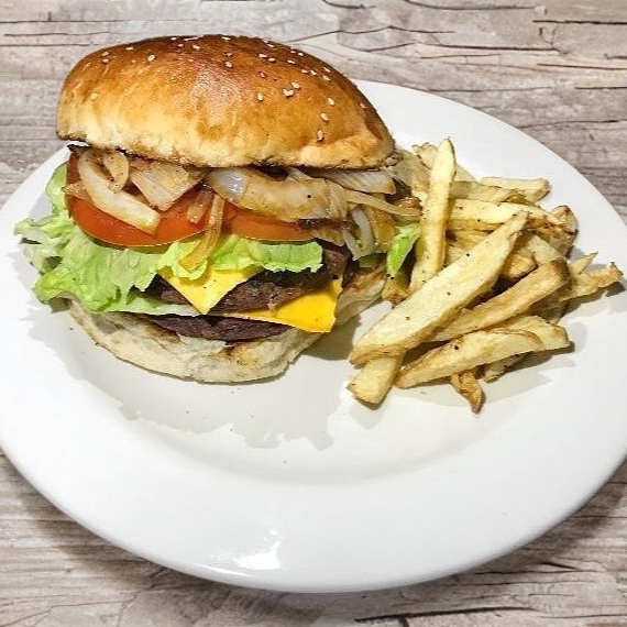 Carne de res, queso amarillo, lechuga, tomate acompañado con papas.
