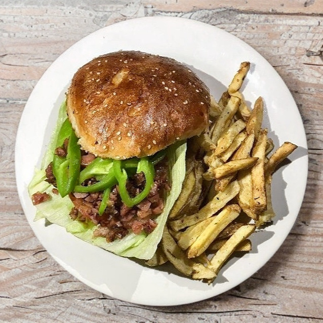 Carne de res, queso amarillo y chihuahua, lechuga, tomate, chile verde en rajas, tocino acompañado con papas.