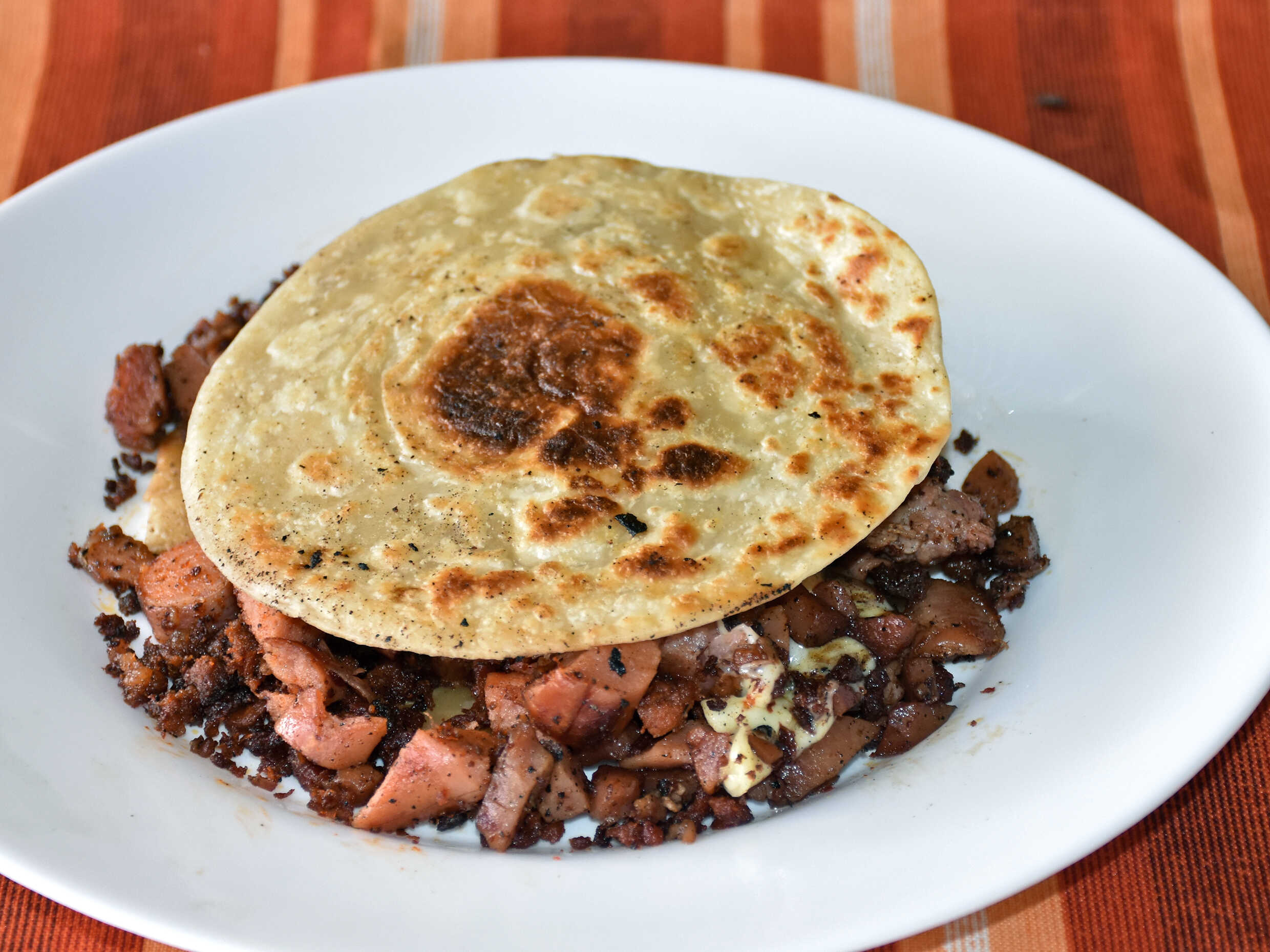 Doble tortilla de harina con queso chihuahua, chorizo, tocino, salchicha rosarito.