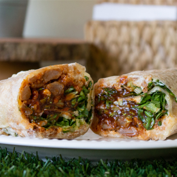 150 gr de pollo en salsa teriyaki, lechuga romana, zanahoria, col morada, frijol chino, cacahuate y aderezo de cilantro en tortilla integral.