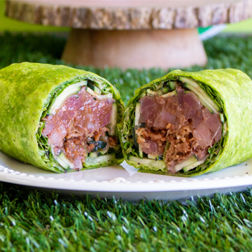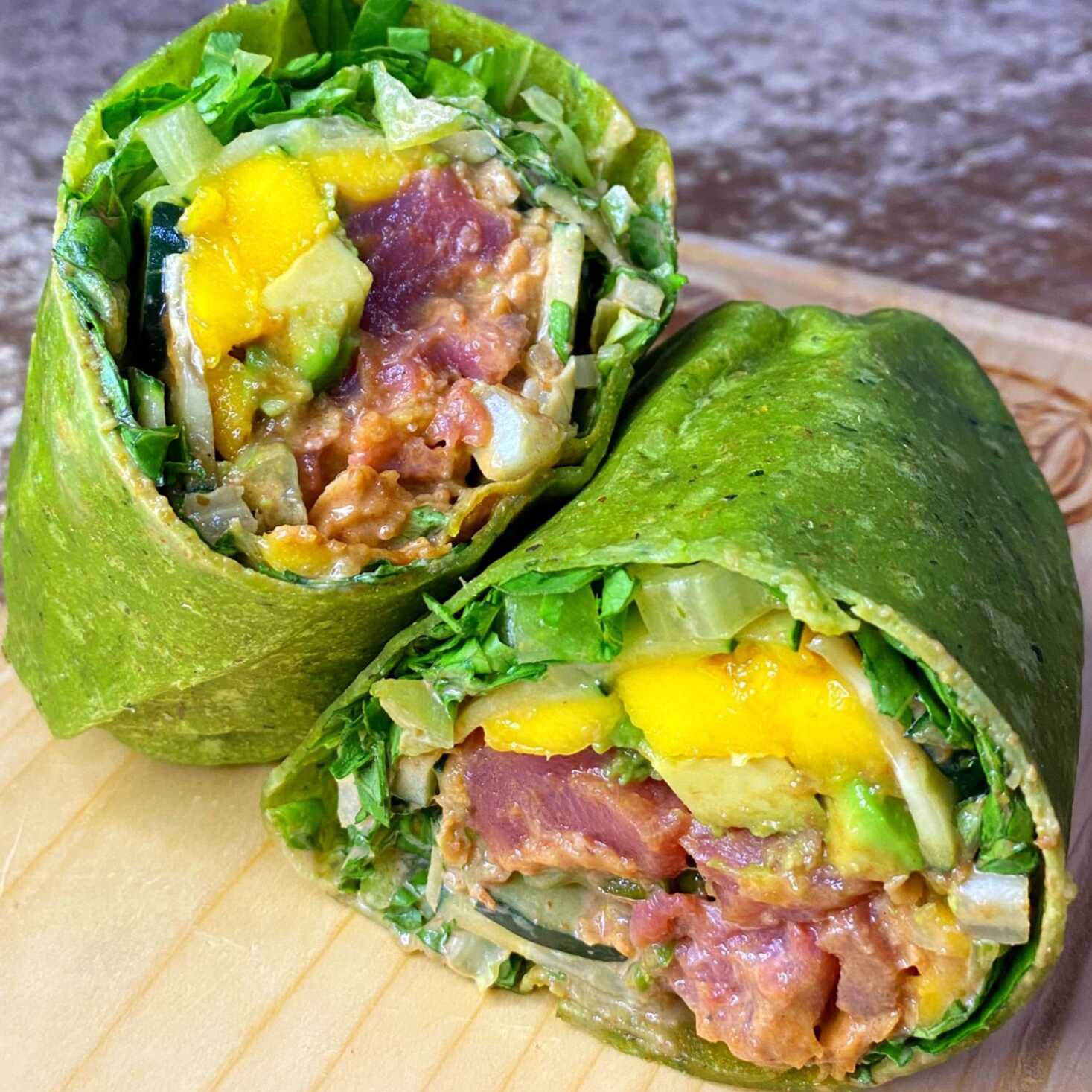 130 gr de atún marinado en salsa negra, aguacate, mango en temporada, tostitos y lechuga romana envuelto en tortilla de espinaca.