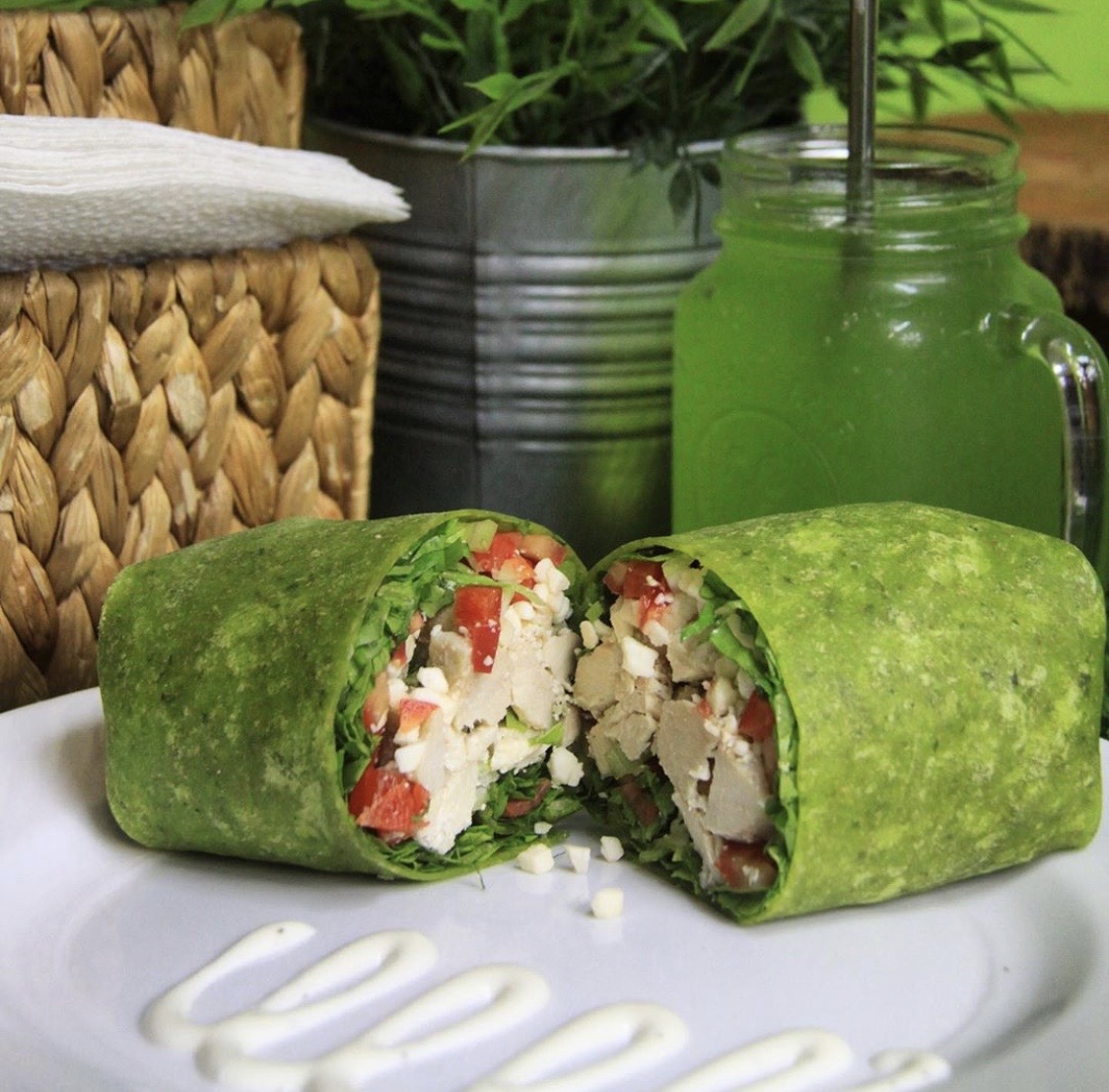 150 gr de pollo, bites de tocino, jamón, queso crema, queso cheddar, lechuga romana y aderezo de cilantro en tortilla de espinaca.