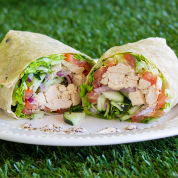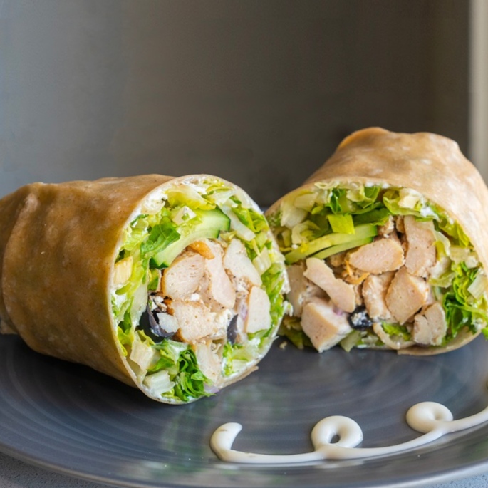 150 gr de pollo, tzatziki, lechuga romana, pepino, cebolla morada, aceituna negra, queso feta y aderezo ranch, envuelto en tortilla integral.