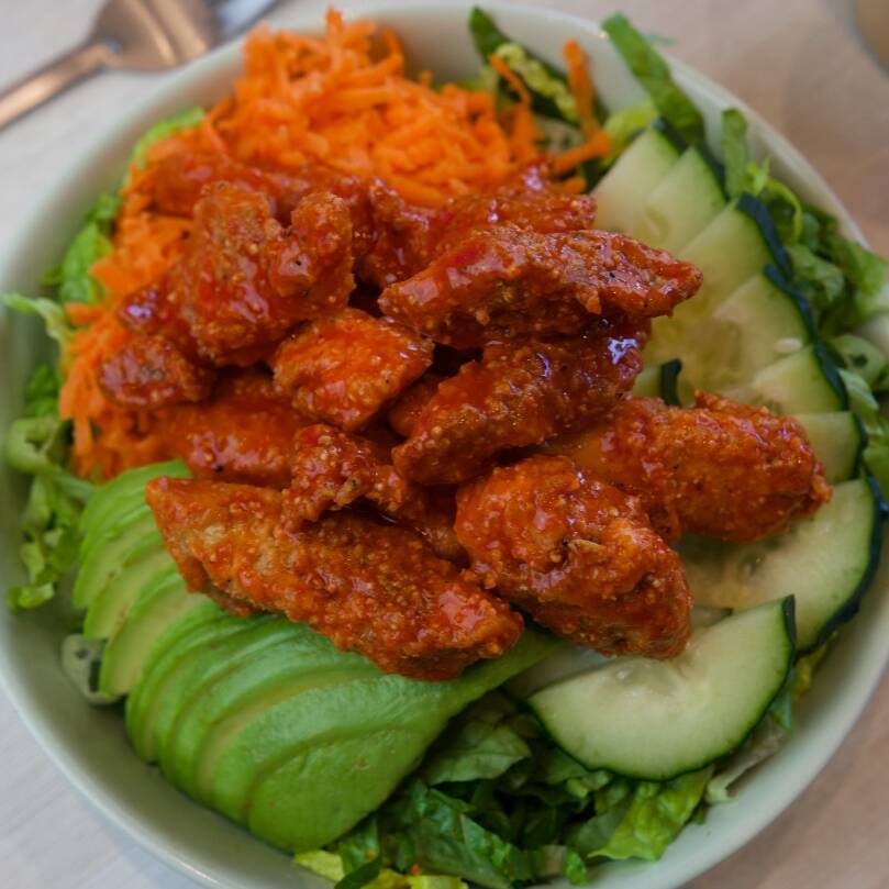 Base a elegir, 150 gr de boneless empanizados en harina de avena y amaranto, zanahoria, pepino y aguacate