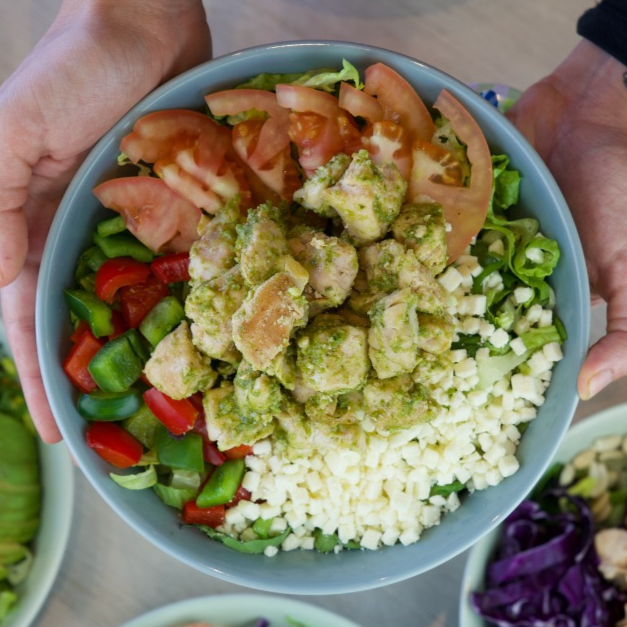 Base a elegir, 150 gr de pollo, bites de tocino, mix de pimientos, mango en temporada, tomate, aguacate y aderezo a elegir.