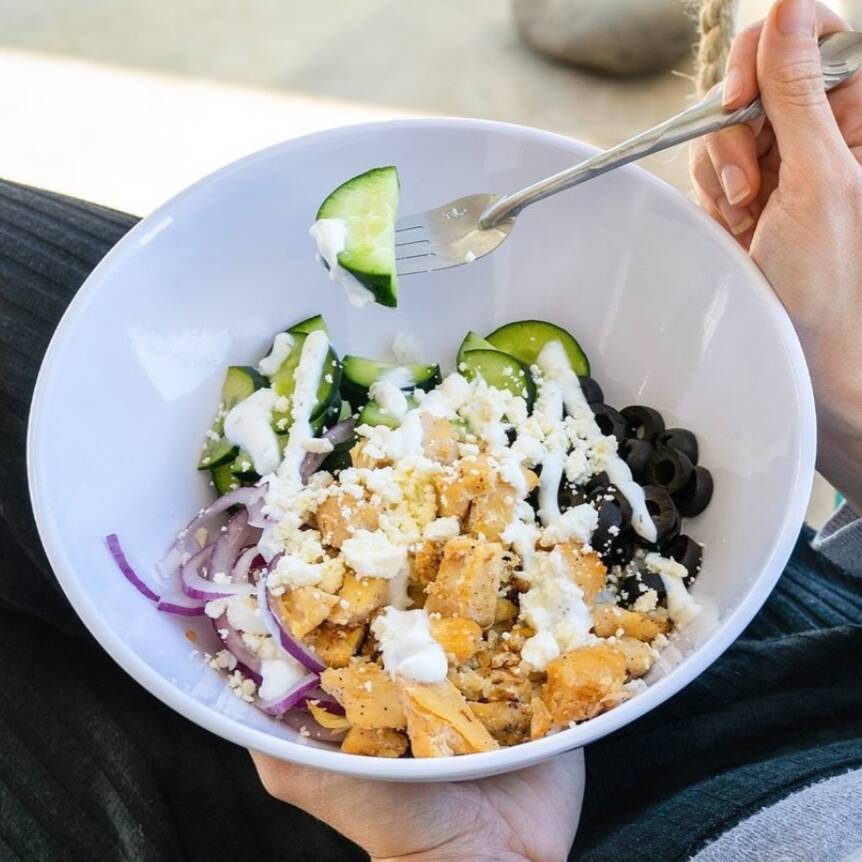 Base a elegir, 150 gr de pollo, aceituna negra, cebolla morada, pepino, queso feta y tzatziki