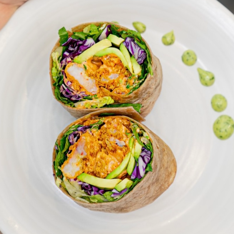 150 gr de boneless empanizados en harina de avena y amaranto, lechuga romana, zanahoria, pepino, aguacate, aderezo ranch en tortilla integral