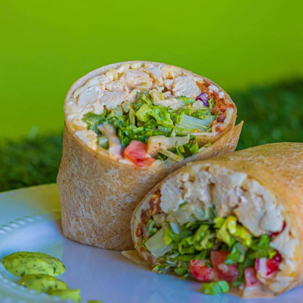 150 gr de pollo, bites de tocino, queso mozarella, queso chihuahua, aguacate, crispy onion, aceituna negra, mix de pimientos, cebolla morada, lechuga romana, aderezo ranch y aderezo chipotle envuelto en tortilla integral.