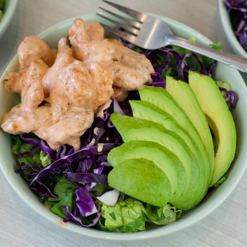Base a elegir, 130 gr de camarón roca empanizado en harina de avena y amaranto, col morada y aguacate