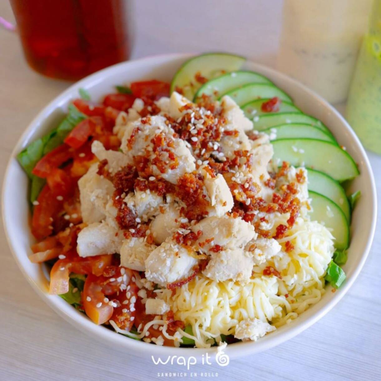 150 gr de pollo, bites de tocino, lechuga romana, cebolla morada, pepino, tomate, queso cheddar y aderezo ranch en tortilla integral.