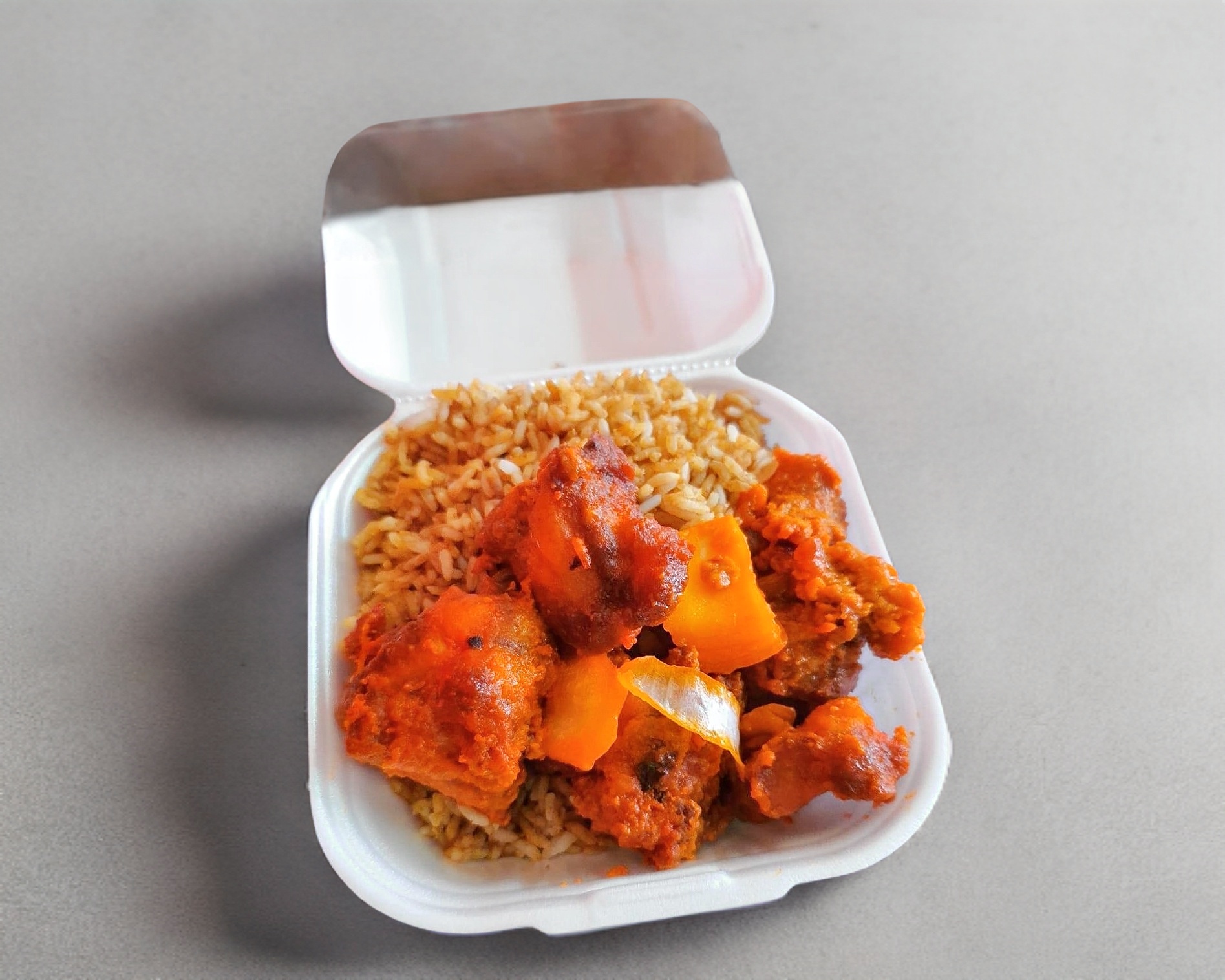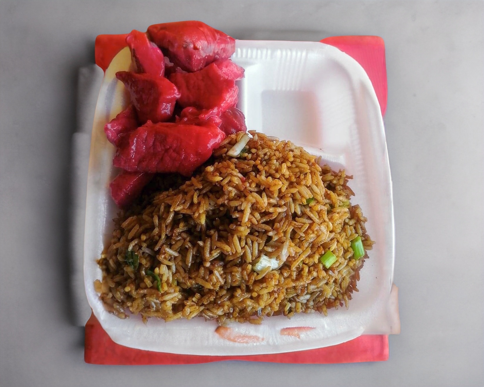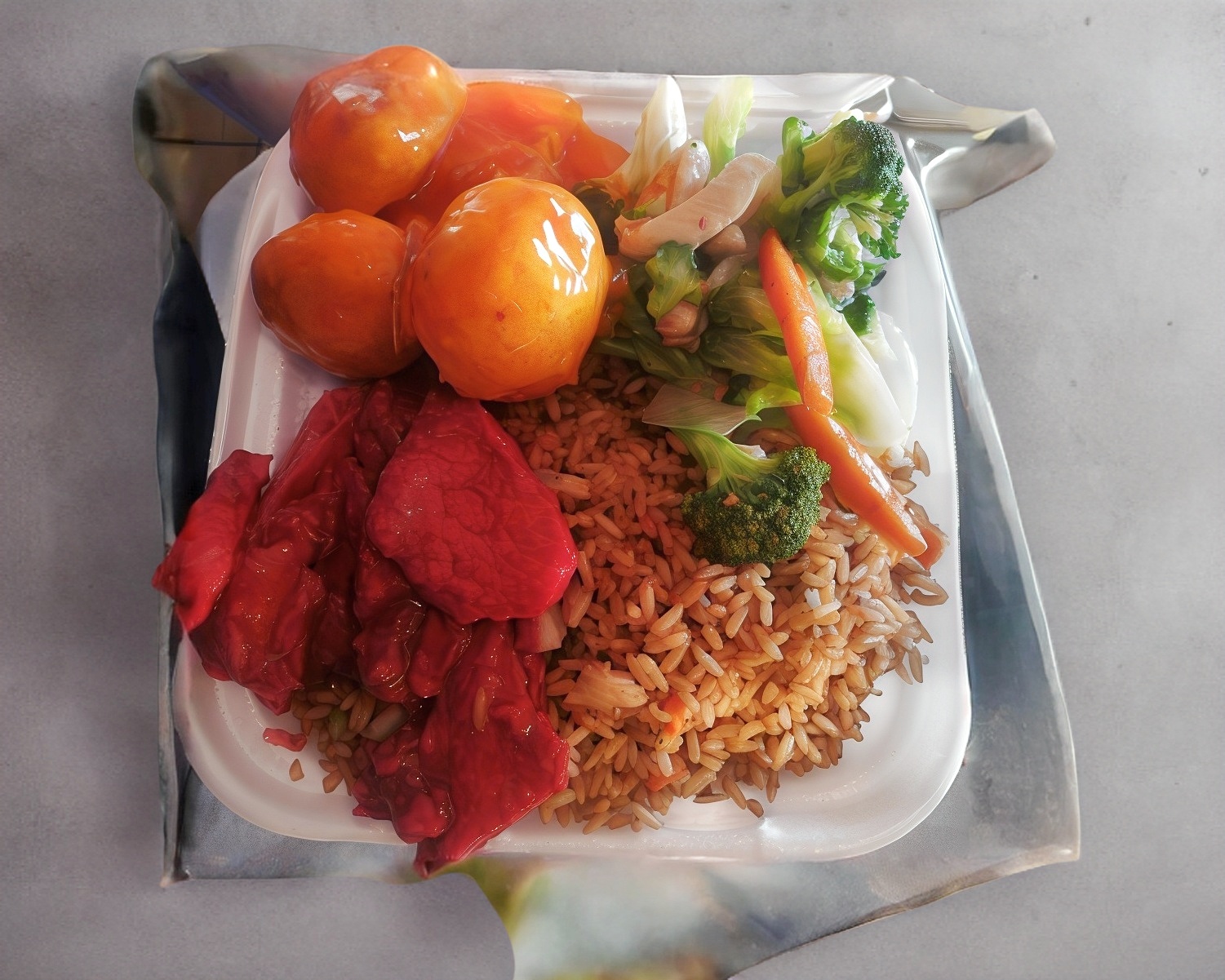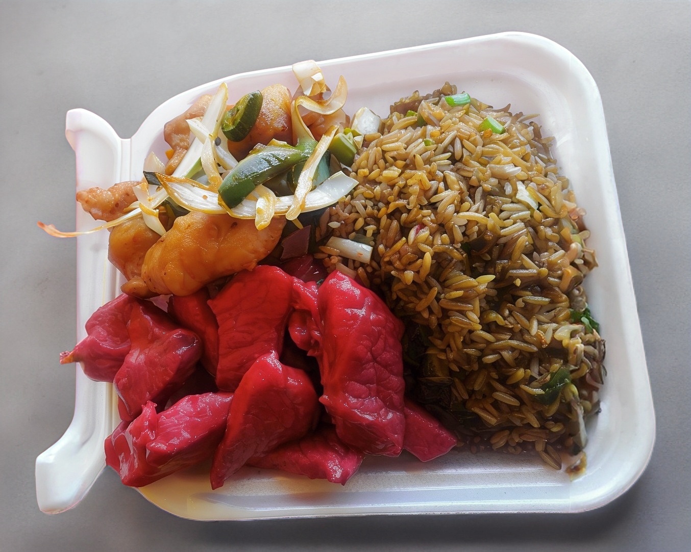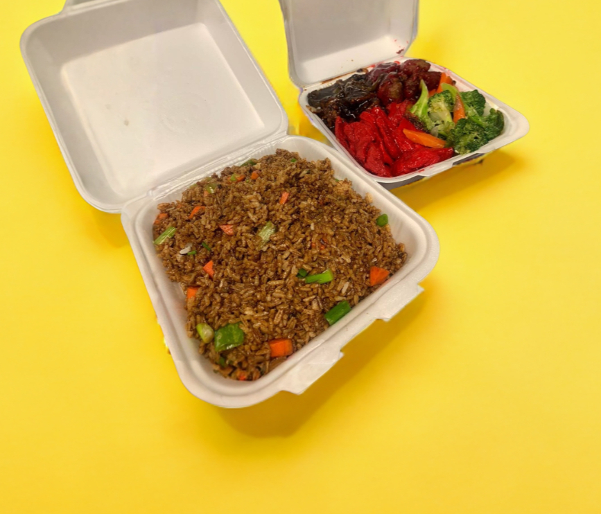 Charola con arroz, shopsuy, combinación china más 1 rollo primavera.