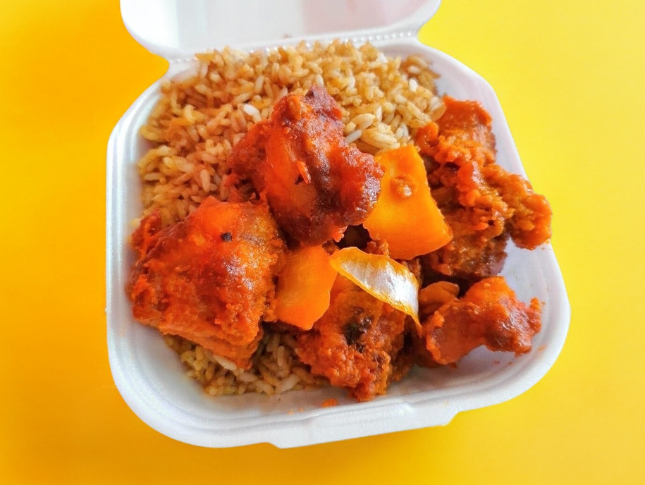 Media porción de arroz, media porción de guiso a elegir, tenedores se venden por separado.