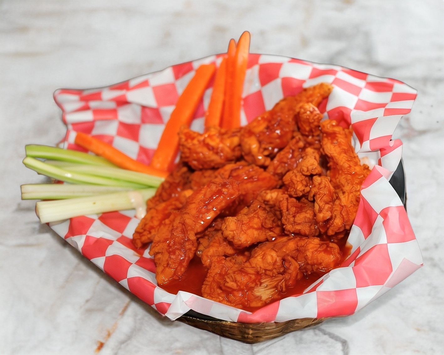 Tiras de pechuga de pollo empanizada y bañada en salsa de tu preferencia. (240 g).
