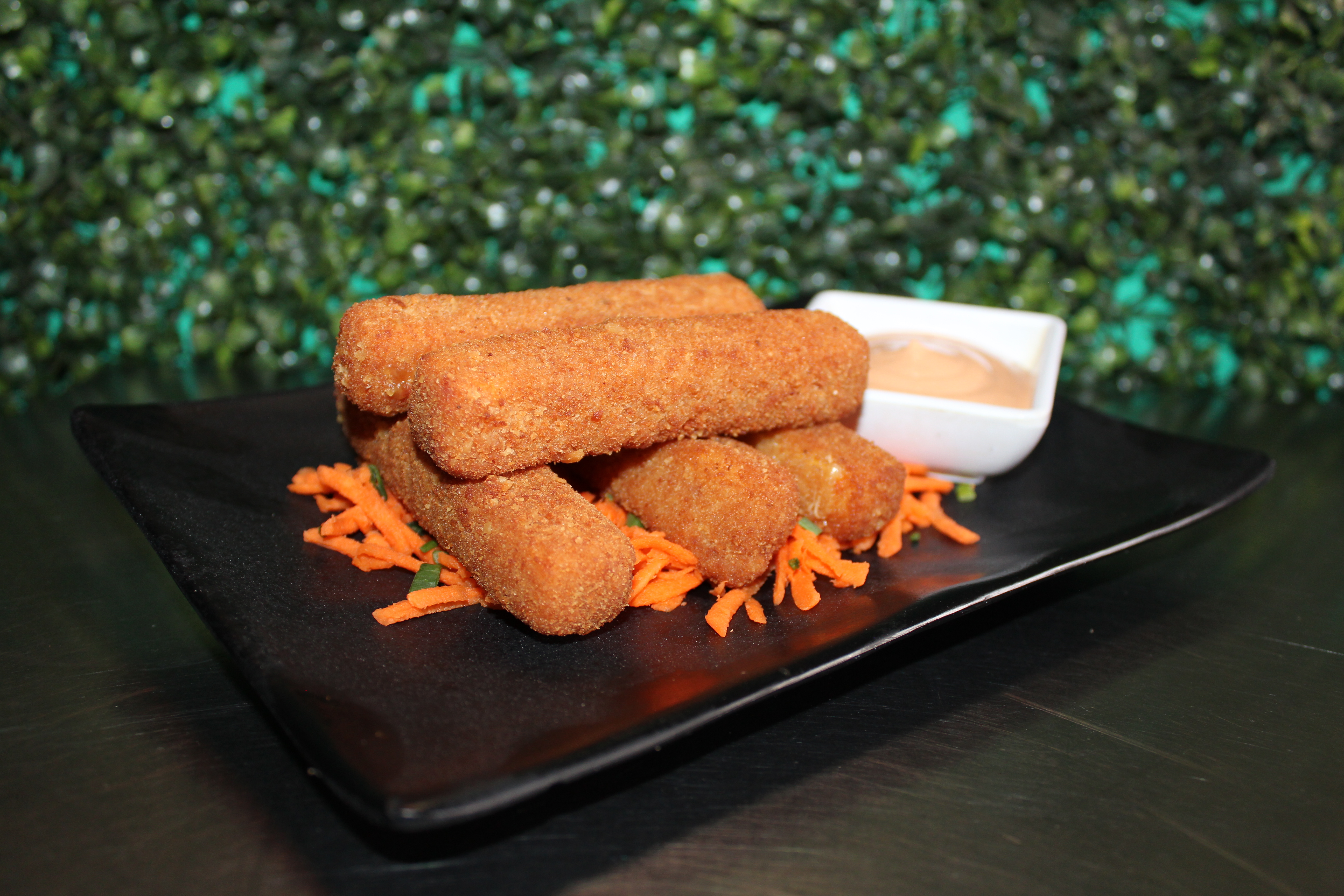 5 pizas de queso mozzarella empanizado acompañadas de salsa de anguila. Plato personal