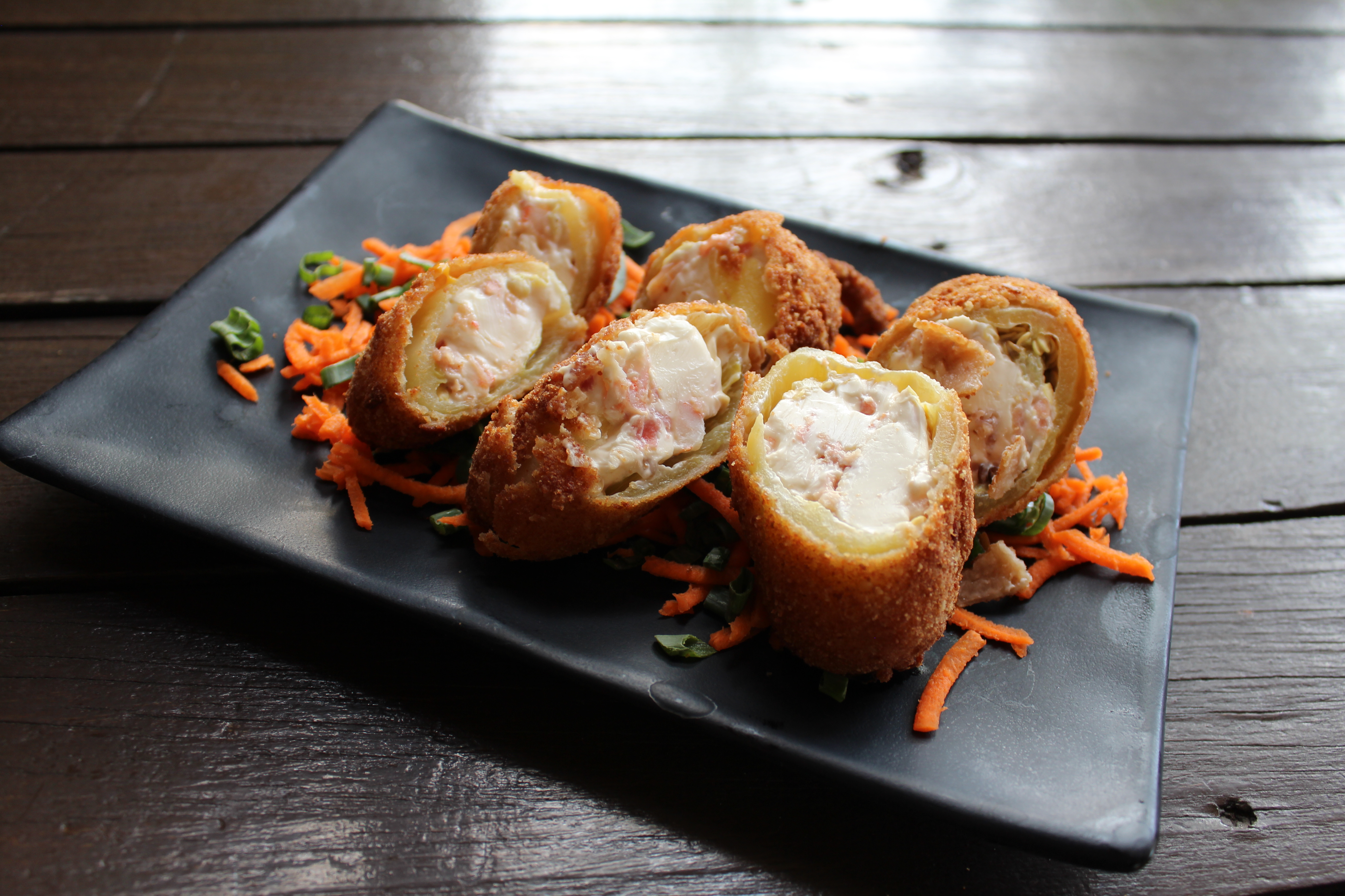 Camarón, tocino, queso crema y aguacate, queso mozzarella por fuera.