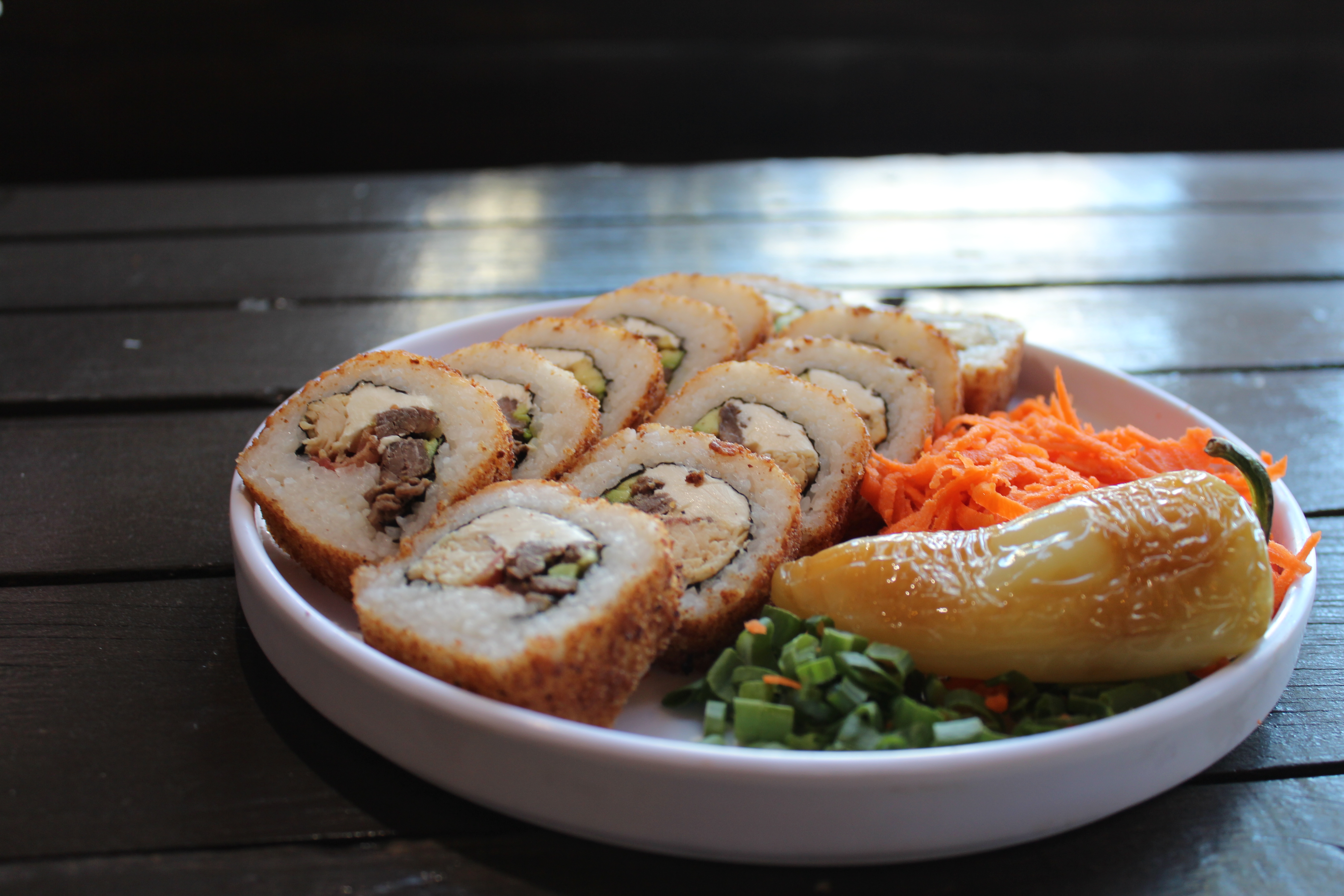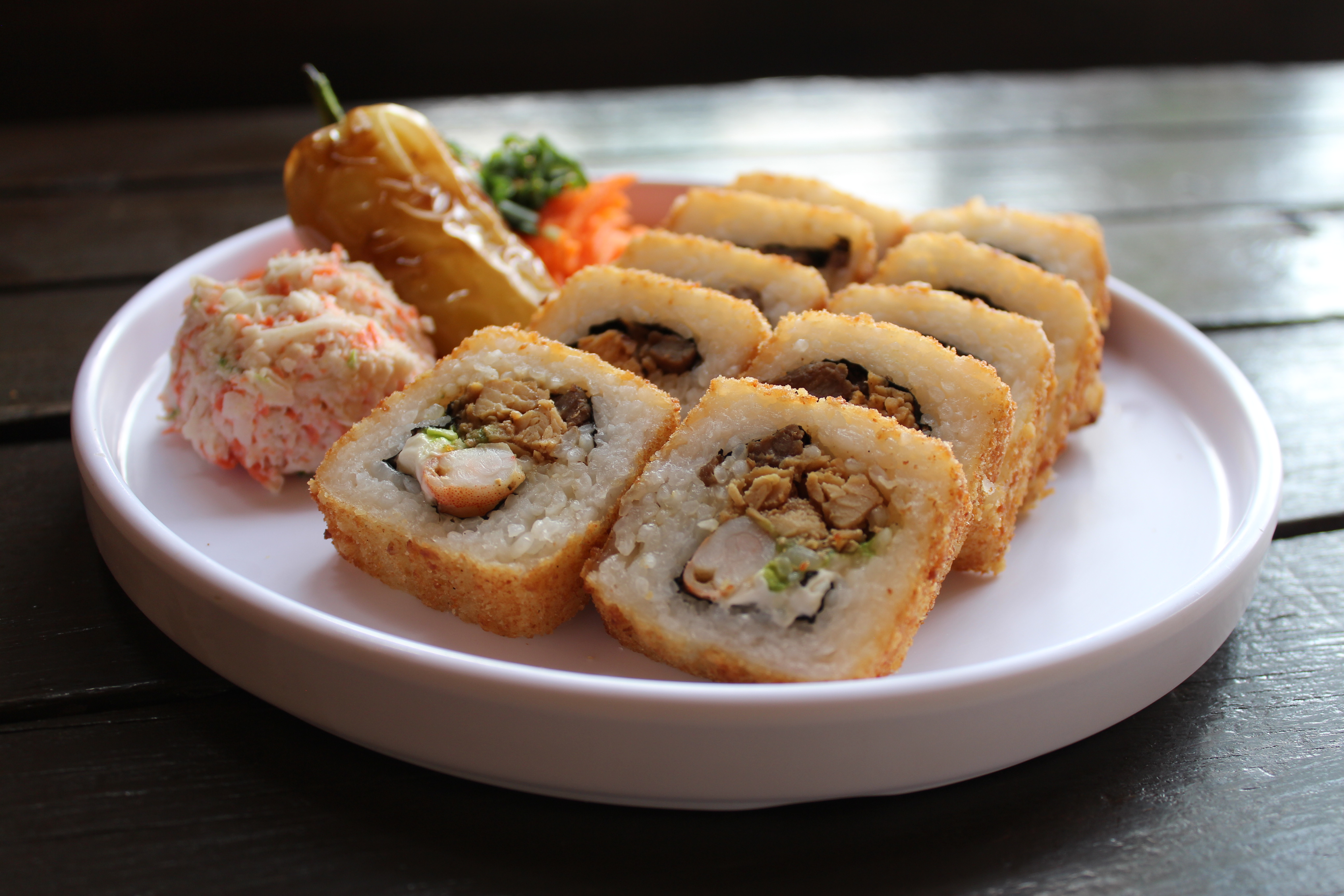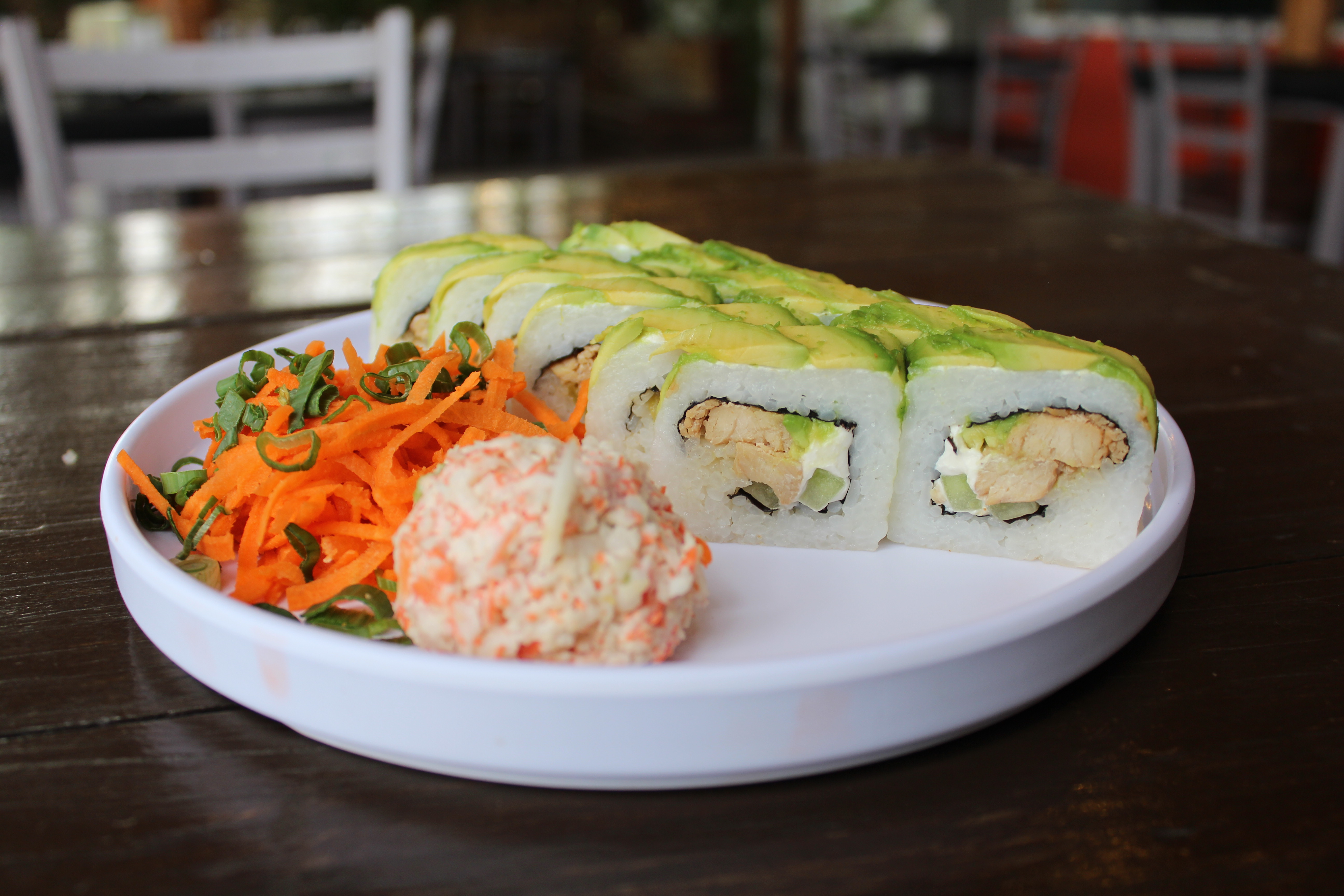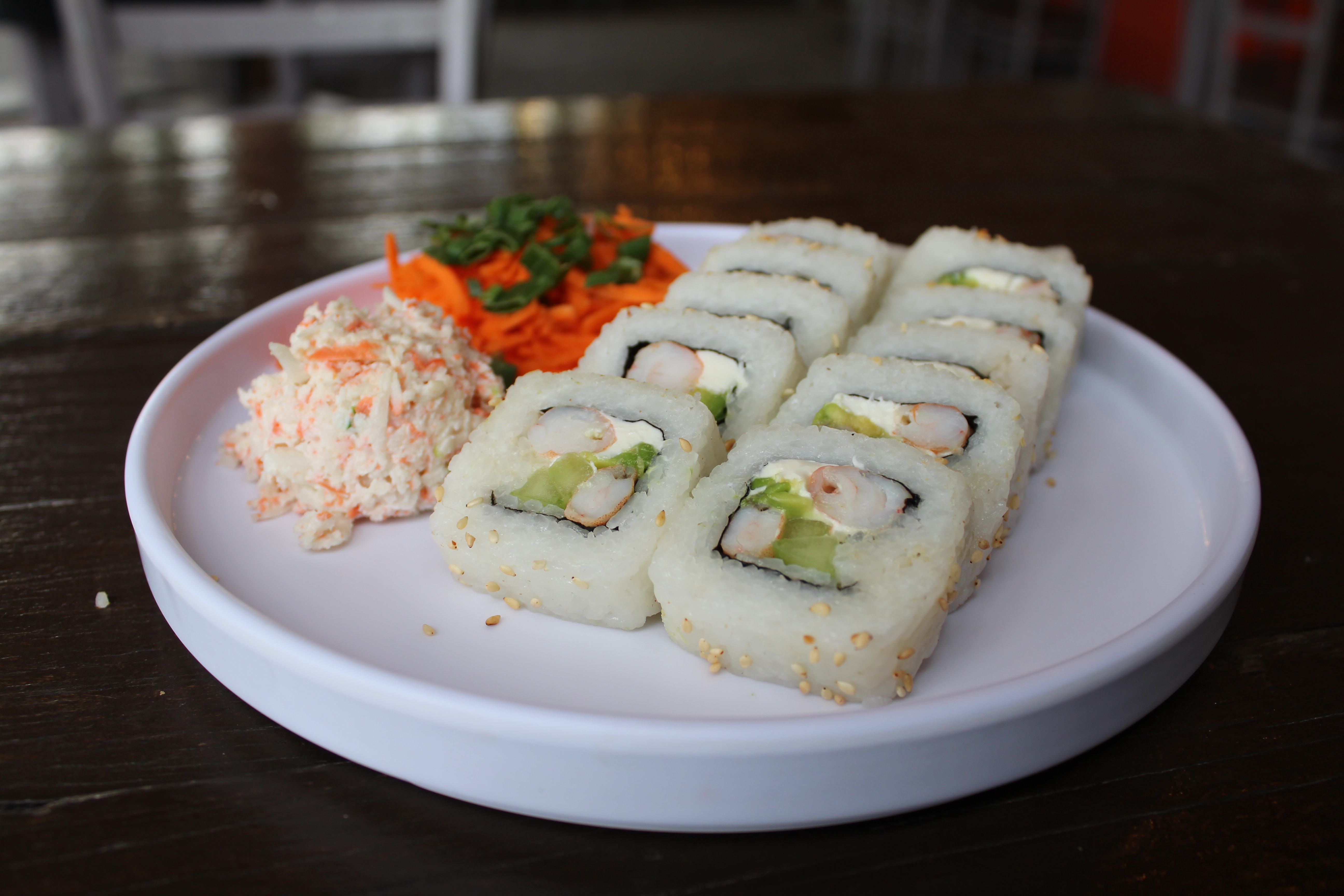 1 rollo de 10 bocados con camarón, res, pollo, queso crema y aguacate acompañados de cebollín y zanahoria.