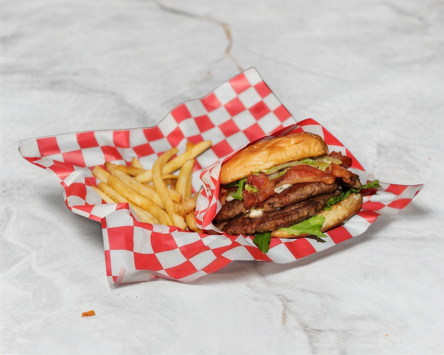 Doble carne arrachera con queso gratinado, tocino y chile verde, aguacate y papas fritas. (300 g).