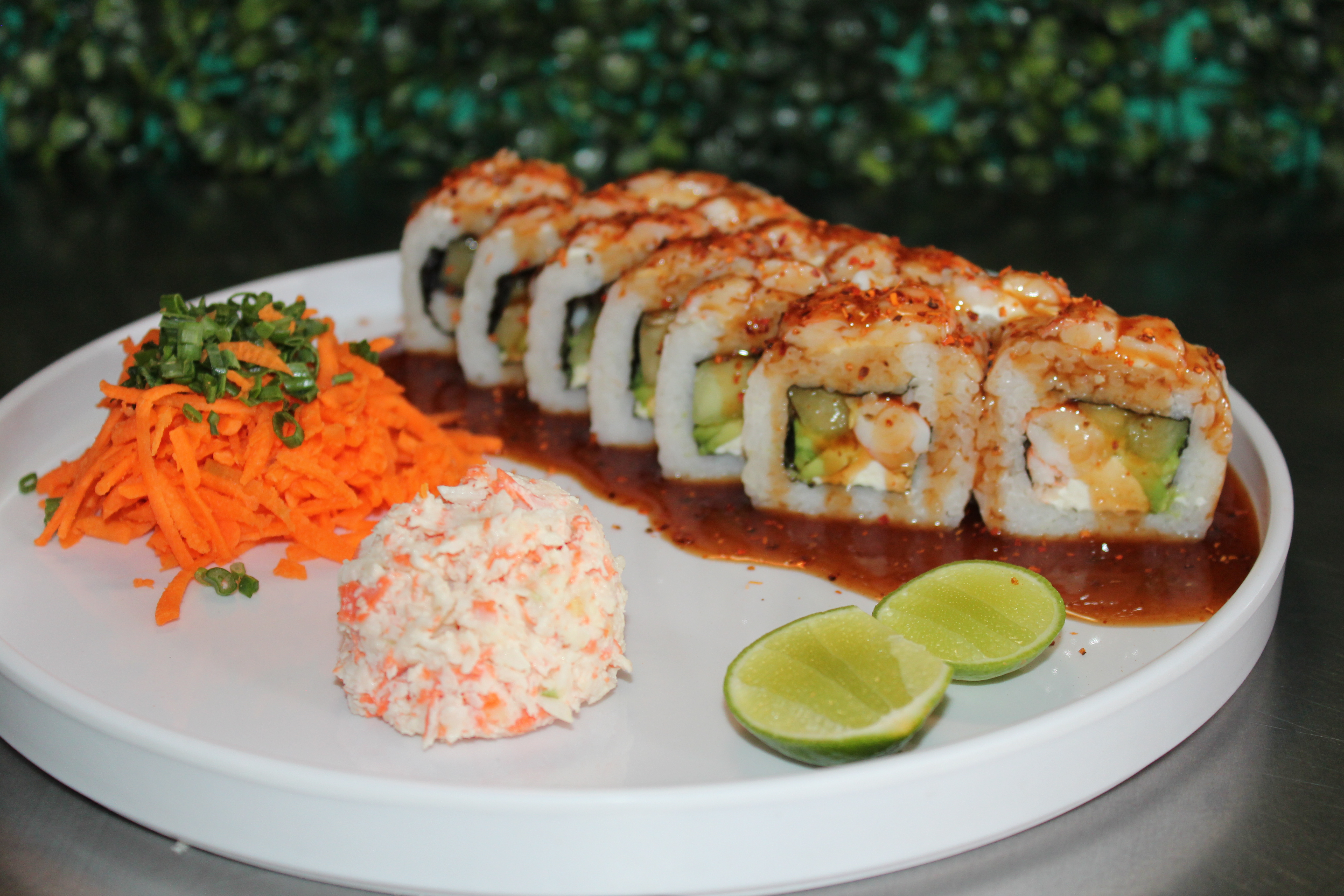 Camarón, pepino, queso crema y aguacate por dentro, por fuera camarón curtido con limón, bañado en salsa negra y Tajín.