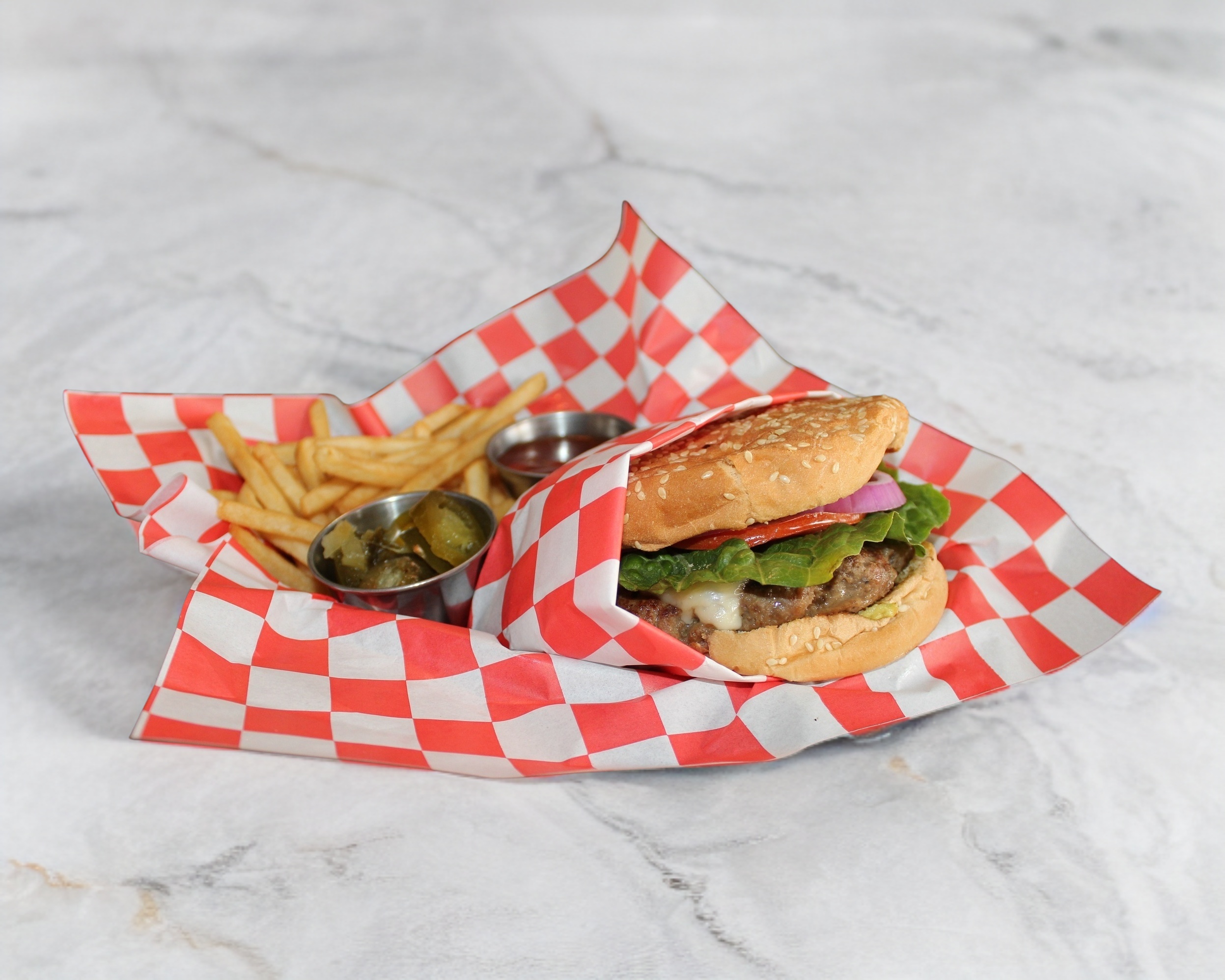 Carne arrachera, queso amarillo, lechuga, tomate, aguacate y papas fritas. (150 g).