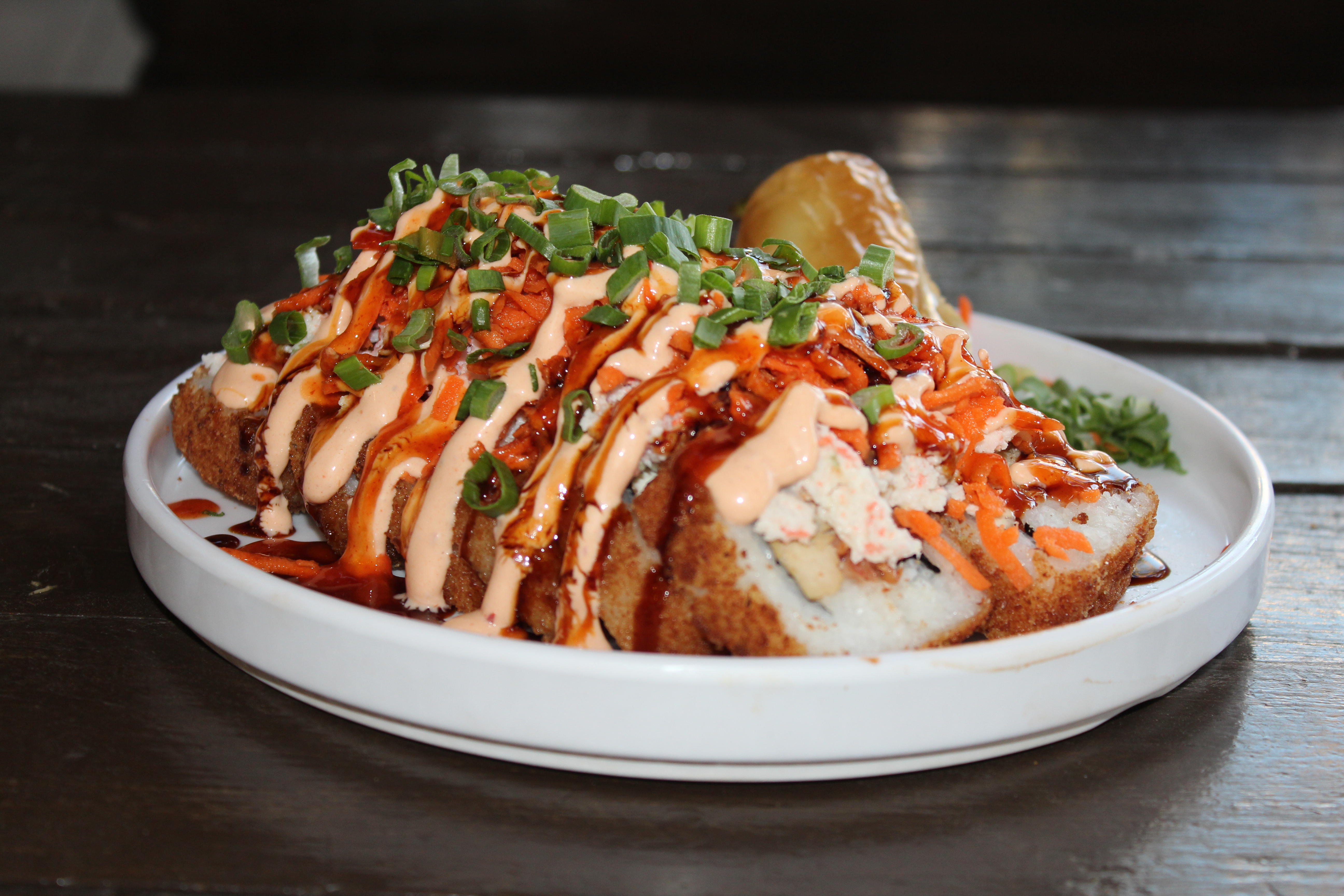 12 piezas de sushi aproximadamente con res, pollo, tocino, queso crema, aguacate, tampico, zanahoria y cebollín arriba, salseado de aderezo chipotle, salsa de anguila y sriracha.