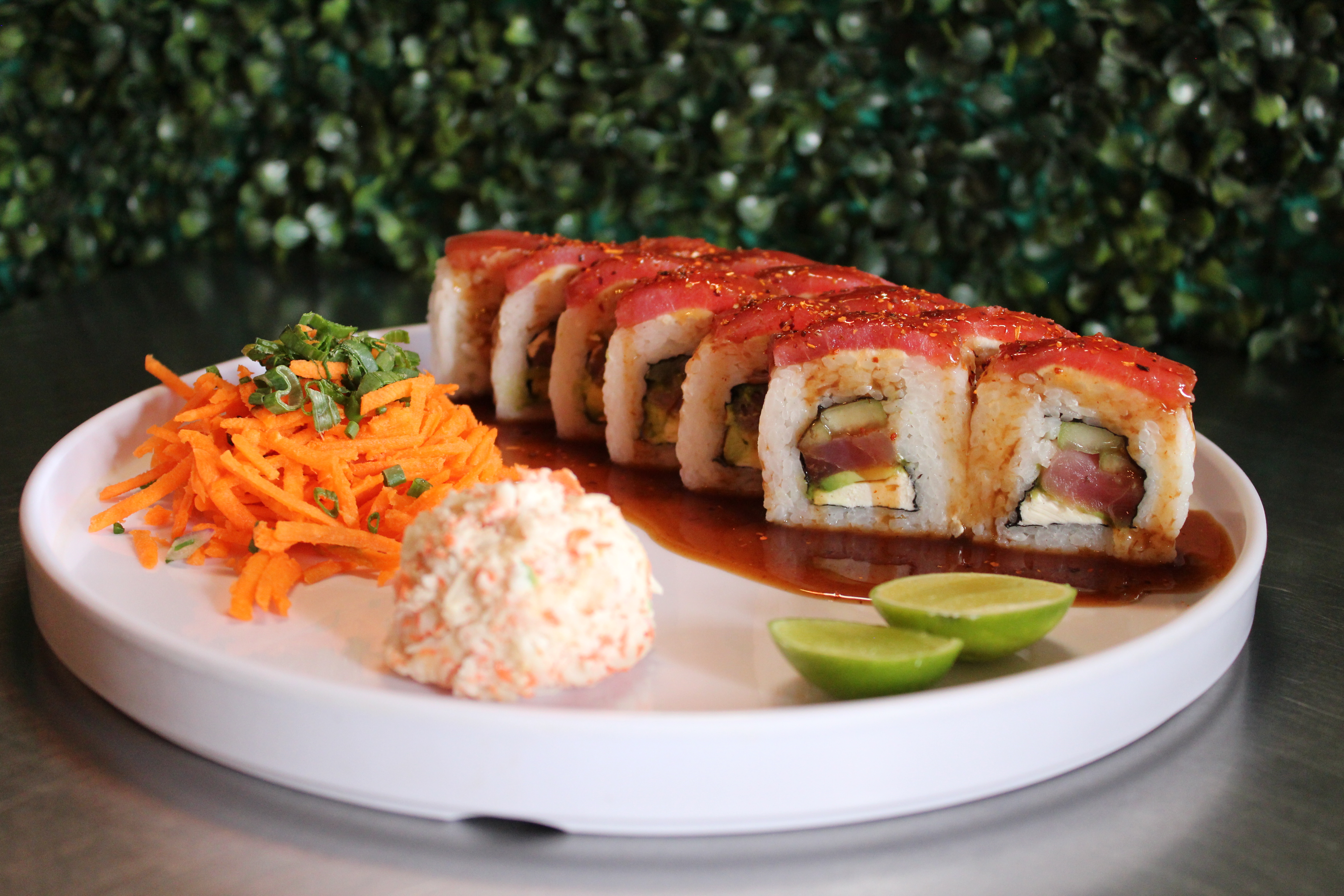 Atún fresco, pepino, queso crema y aguacate por dentro, por fuera láminas de atún bañadas con limón, salsa especial y Tajín.