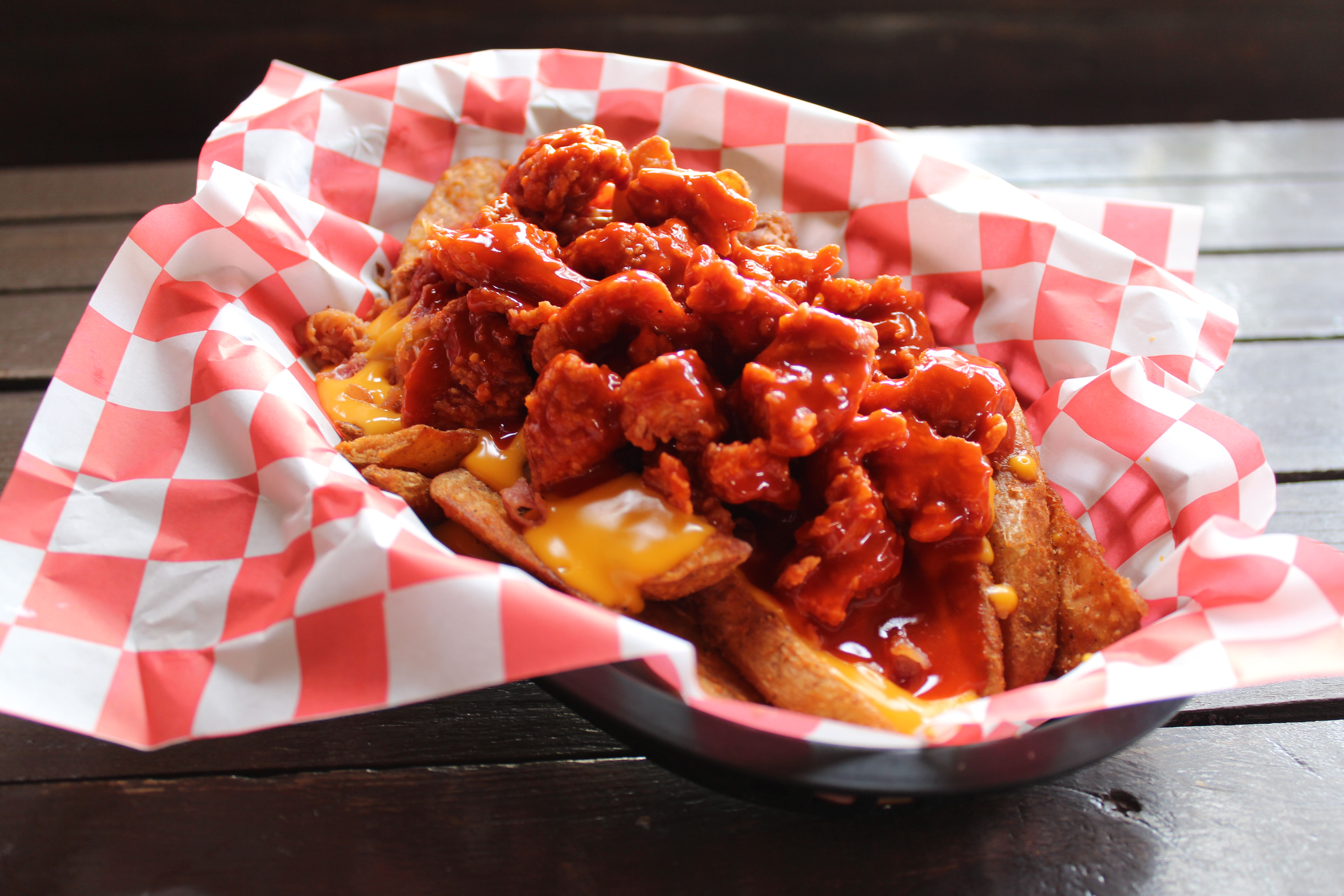 Boneless bañados en salsa a elegir, queso amarillo, aguacate y papas fritas. (180 g).