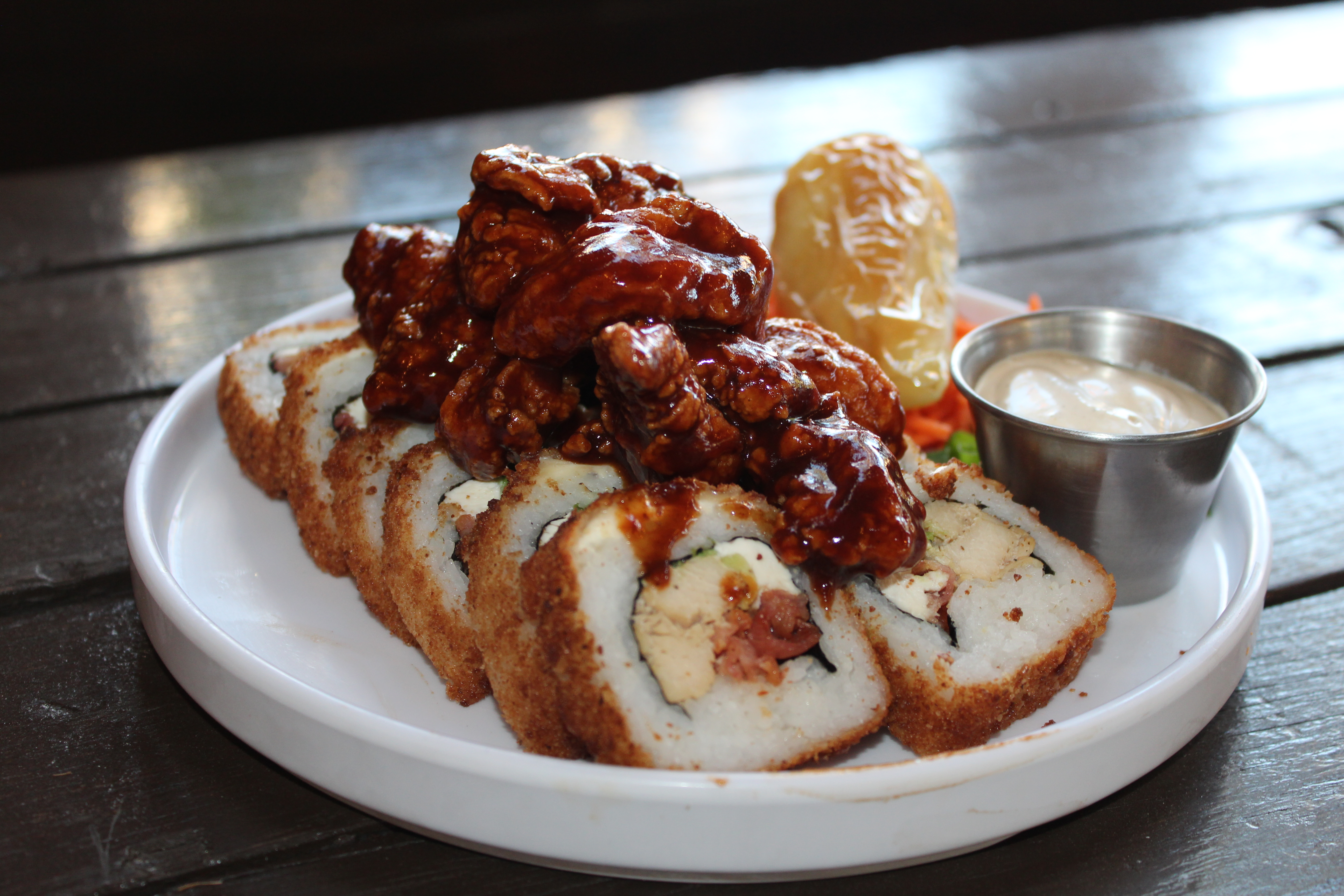 12 piezas de sushi aproximadamente con res, pollo, tocino, queso crema y aguacate con boneless, 120 g de pechuga empanizada y bañada en salsa de tu preferencia.