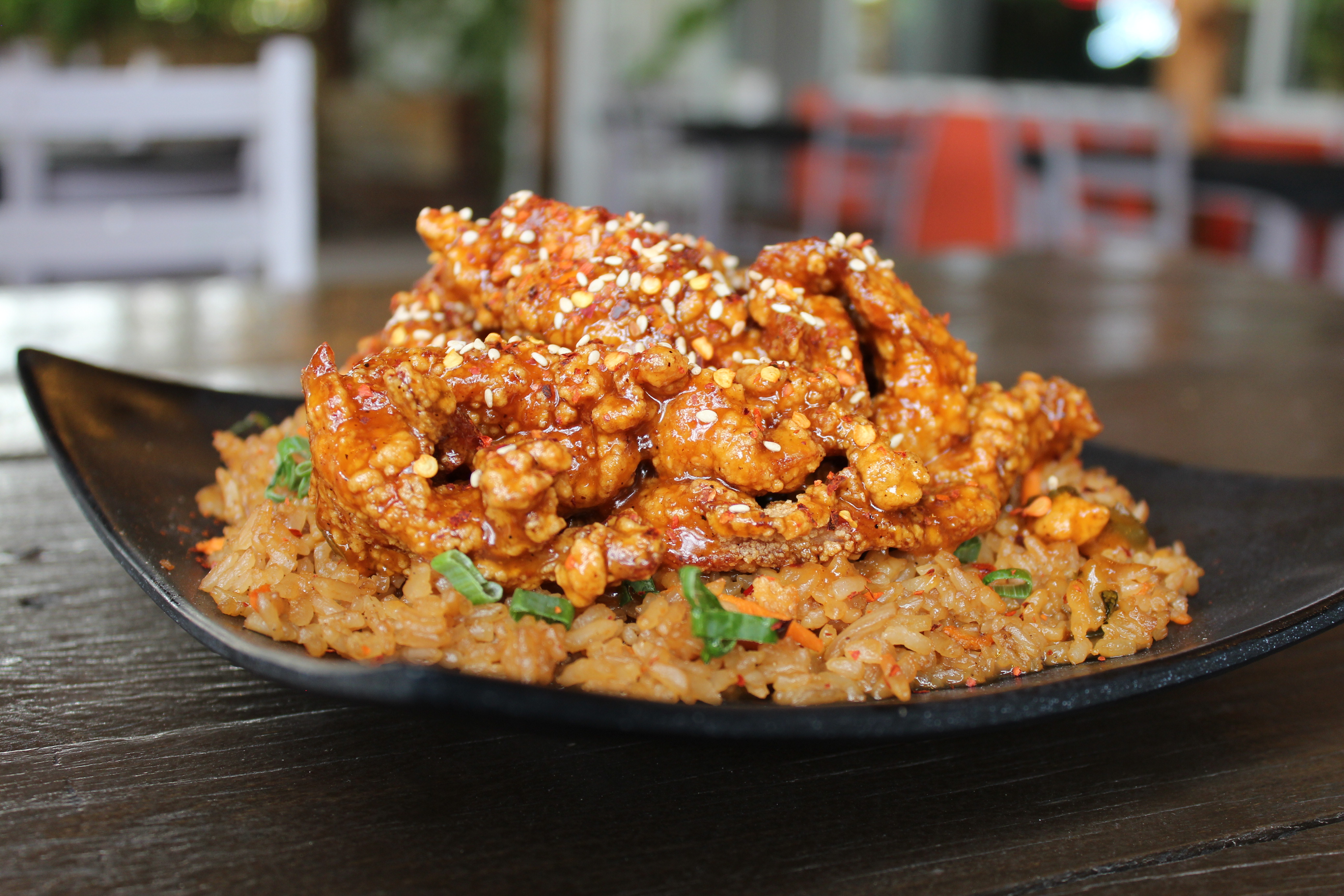 Tiras de pechuga de pollo empanizada, bañadas en exquisita salsa de naranja, acompañadas de una cama de arroz frito con vegetales. 250 g.