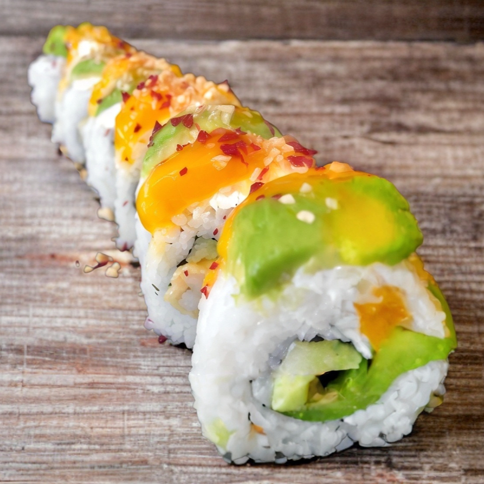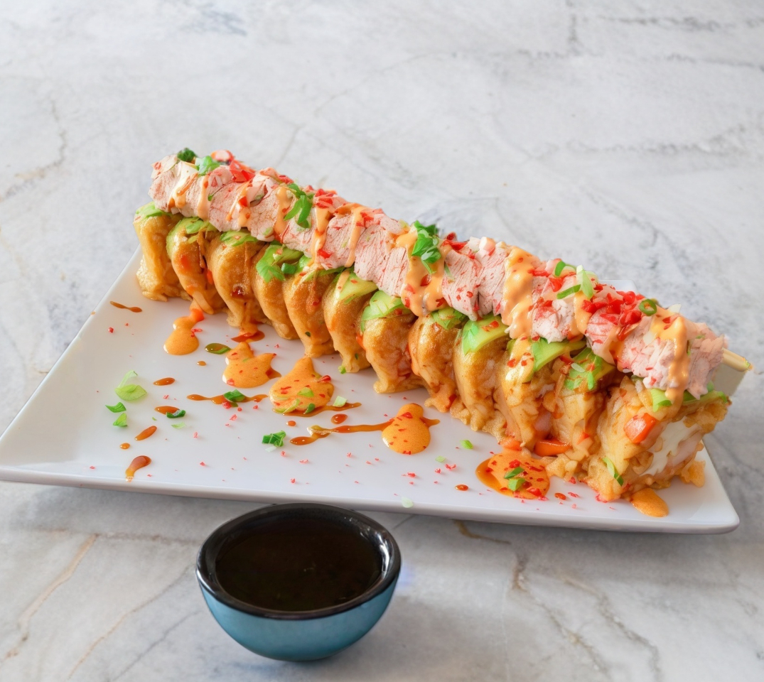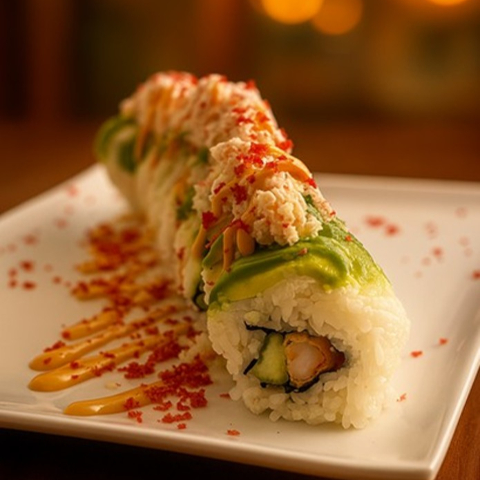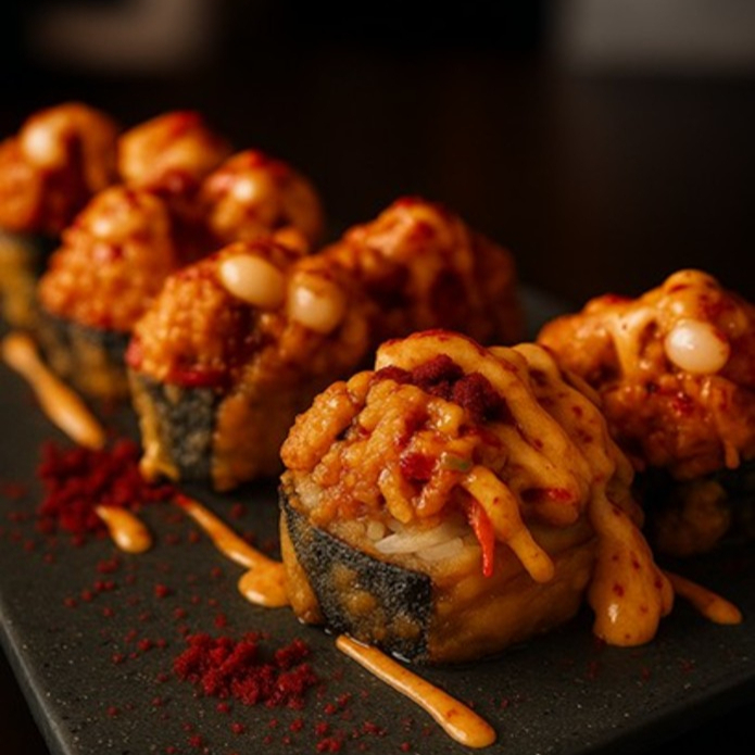 Rollo relleno de camarón tempura, queso crema y aguacate, cubierto con queso gratinado y un toque de aderezo spicy para un sabor intenso y cremoso. 🍣🔥. Incluye salsa soya y aderezo chipotle para el remix final.