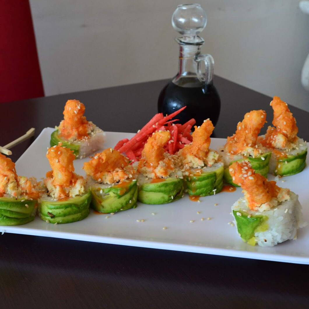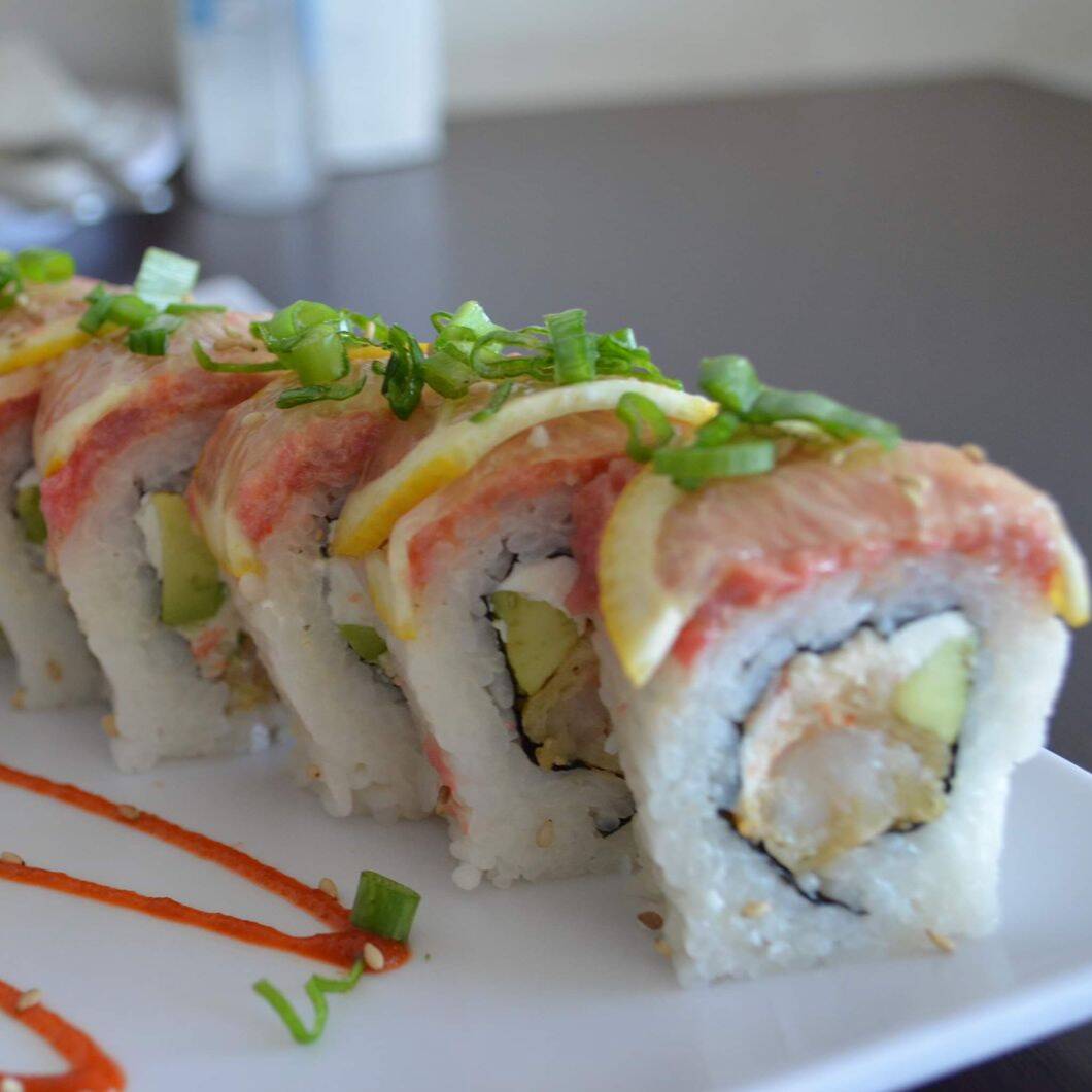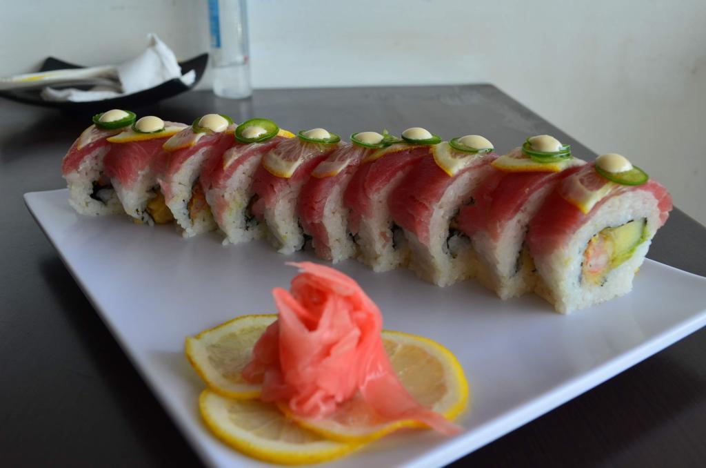 Sushi natural, camaron por dentro, queso crema, tampico y aguacate, se cubre de atun spicy con laminas de limon real por fuera