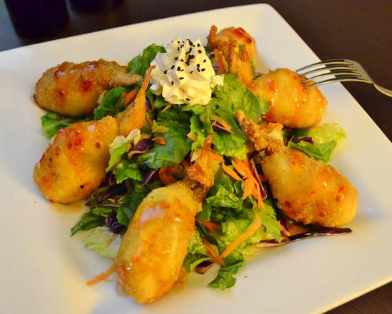 Seis piezas de camarón rellena de queso crema, empanizado, sobre cama de mix de lechuga, bañado en salsa dulce..