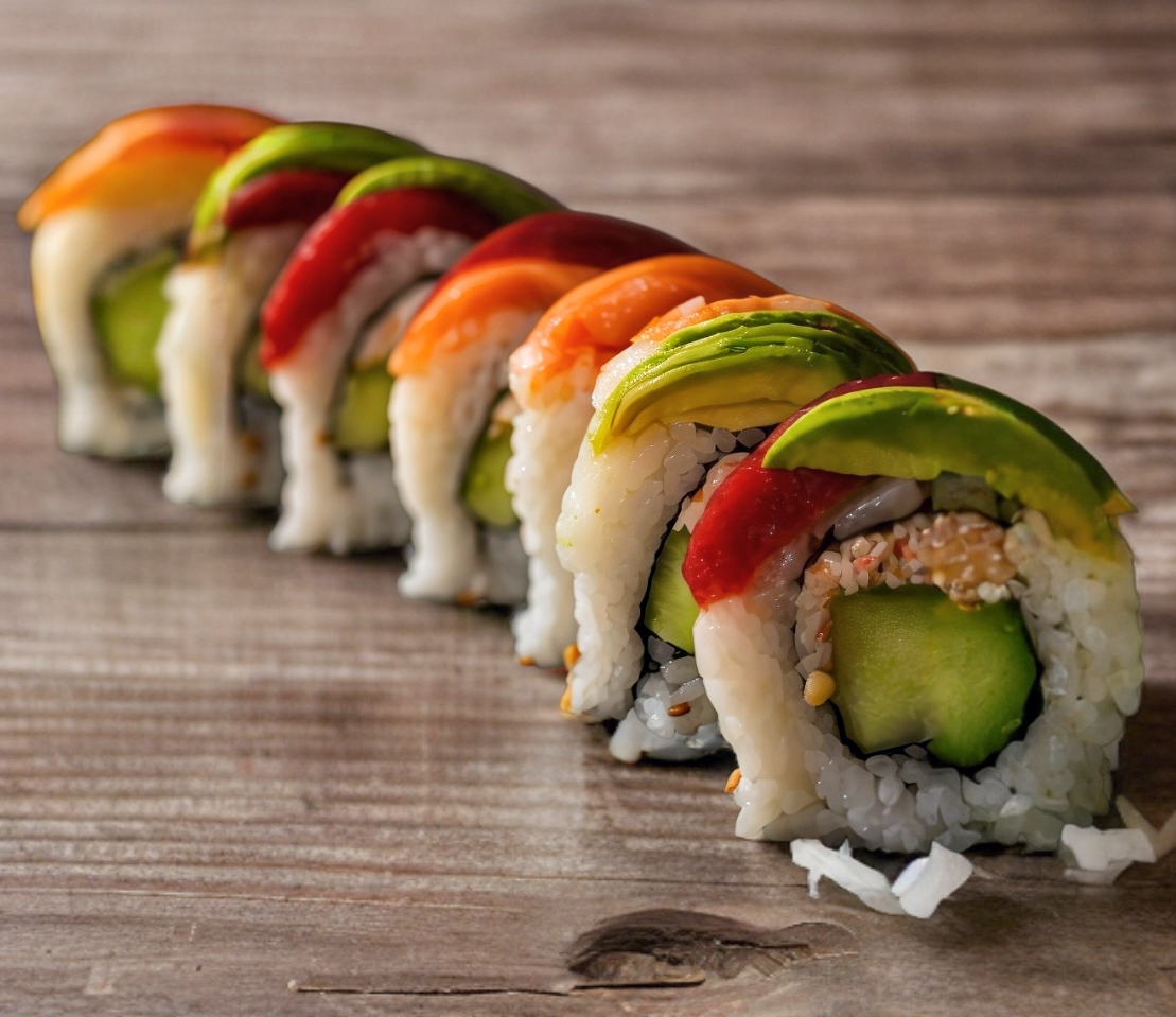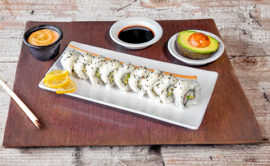 Cangrejo o camarón con queso crema, aguacate y pepino por dentro, con un toque de ajonjolí. Incluye soya y chipotle.