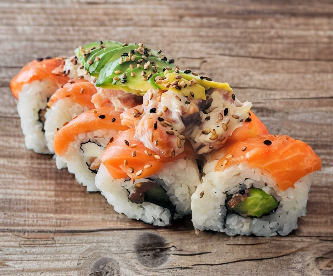 Lo cubrimos de mango y aguacate, por dentro camarón tempura. o salmón y queso crema, con trocitos de cacahuate y crunchy japonés. Incluye soya y chipotle..