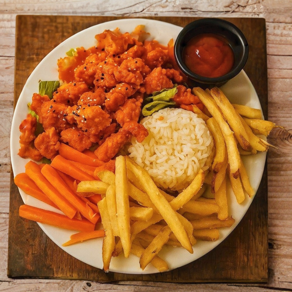 280g de pechuguita de pollo empanizada, bien crujiente y bañada en la salsa que te prende (elige entre BBQ, Búfalo, Cookies, Mango o Habanero). Acompañados de bastones de zanahoria y tu elección: arroz al vapor o yakimeshi 🍚 Perfecto para cuando el hambre no perdona y quieres puro power en cada bocado 💥. Incluye Ranch.