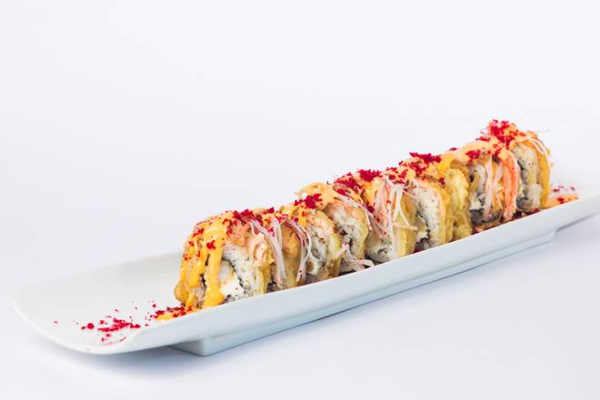 Camarón tempura y queso crema por dentro, cubierto de salmón, empanizado en tempura, cubierto de tiras de cangrejo, bañado en aderezo chipotle y crunchy japonés.(Empanizado.