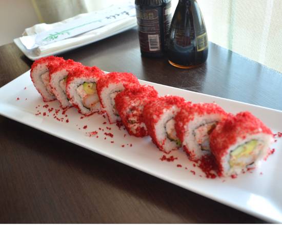 Con camarón por dentro, aguacate y pepino, se cubre con atún, rodajas de limón real y jalapeño, con un toque de aderezo creamy. Incluye soya y chipotle.