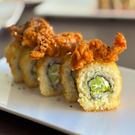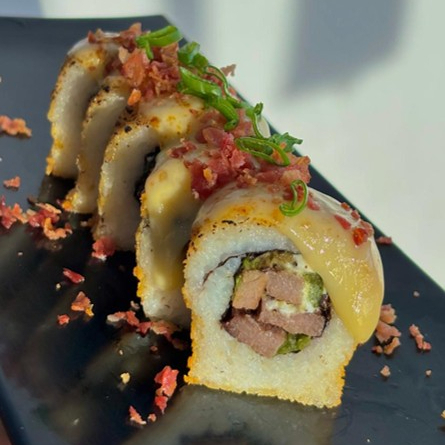 Con arroz yakimeshi, camarón tempura crujiente y queso crema por dentro. Por fuera, aguacate fresco y un coronado de Tampico que explota con ese 'punch' irresistible. ¡Cada bocado es un beat: sabroso, intenso y con puro flow! Acompañado de salsa soya y aderezo chipotle para tu propio remix..