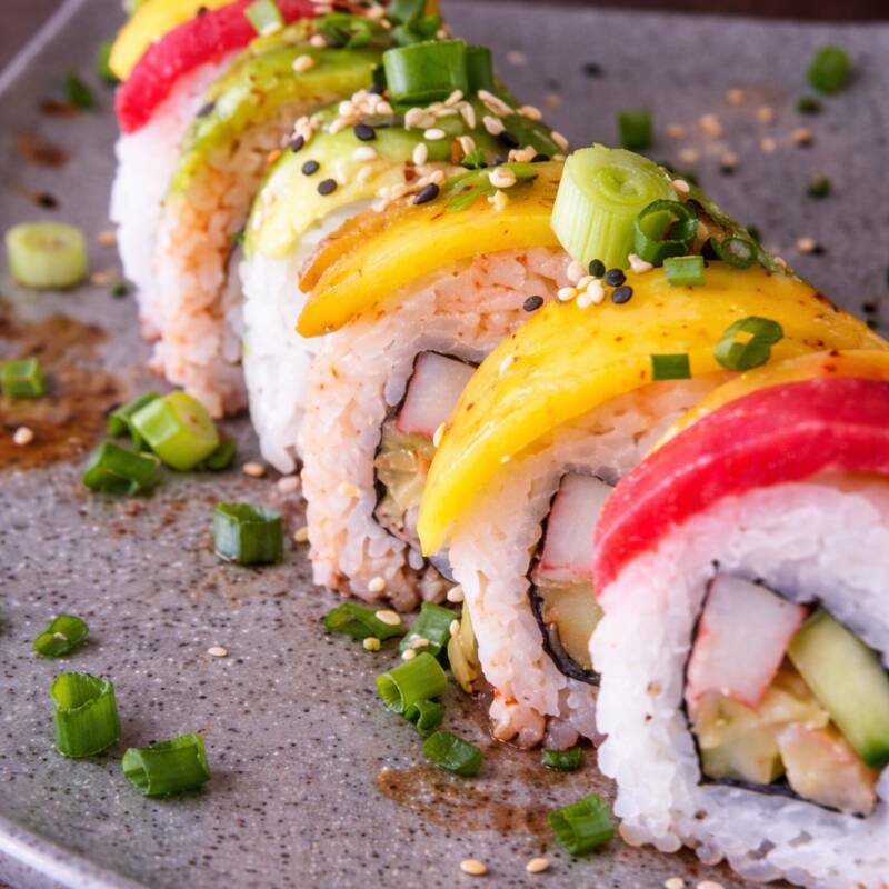 PD: Camaron tempura, kanikama y pepino. PF: Laminas de atun, aguacate y mango.