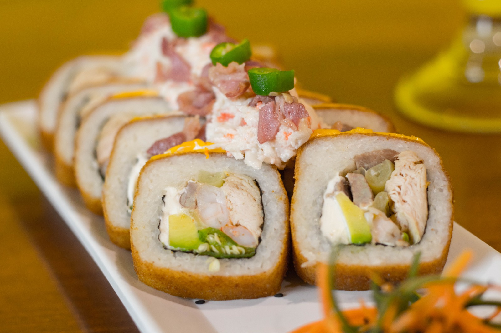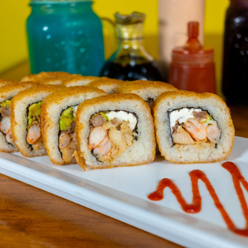Philadelphia, aguacate, pepino, pollo y tocino por dentro, aguacate por fuera con topping de tampico con camarón empanizado, acompañado de zanahoria, chile toreado, aderezo chipotle y soya.