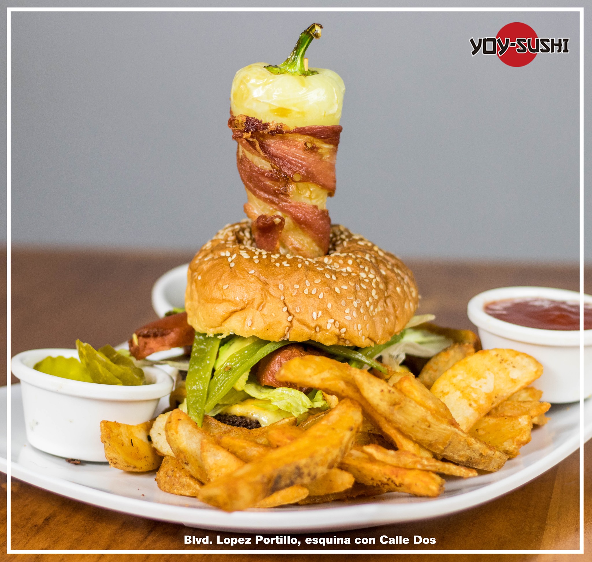 Hamburguesa doble carne con lechuga, tomate, cebolla, salchicha y tocino, y acompañada de papas a la francesa o zasonadas.