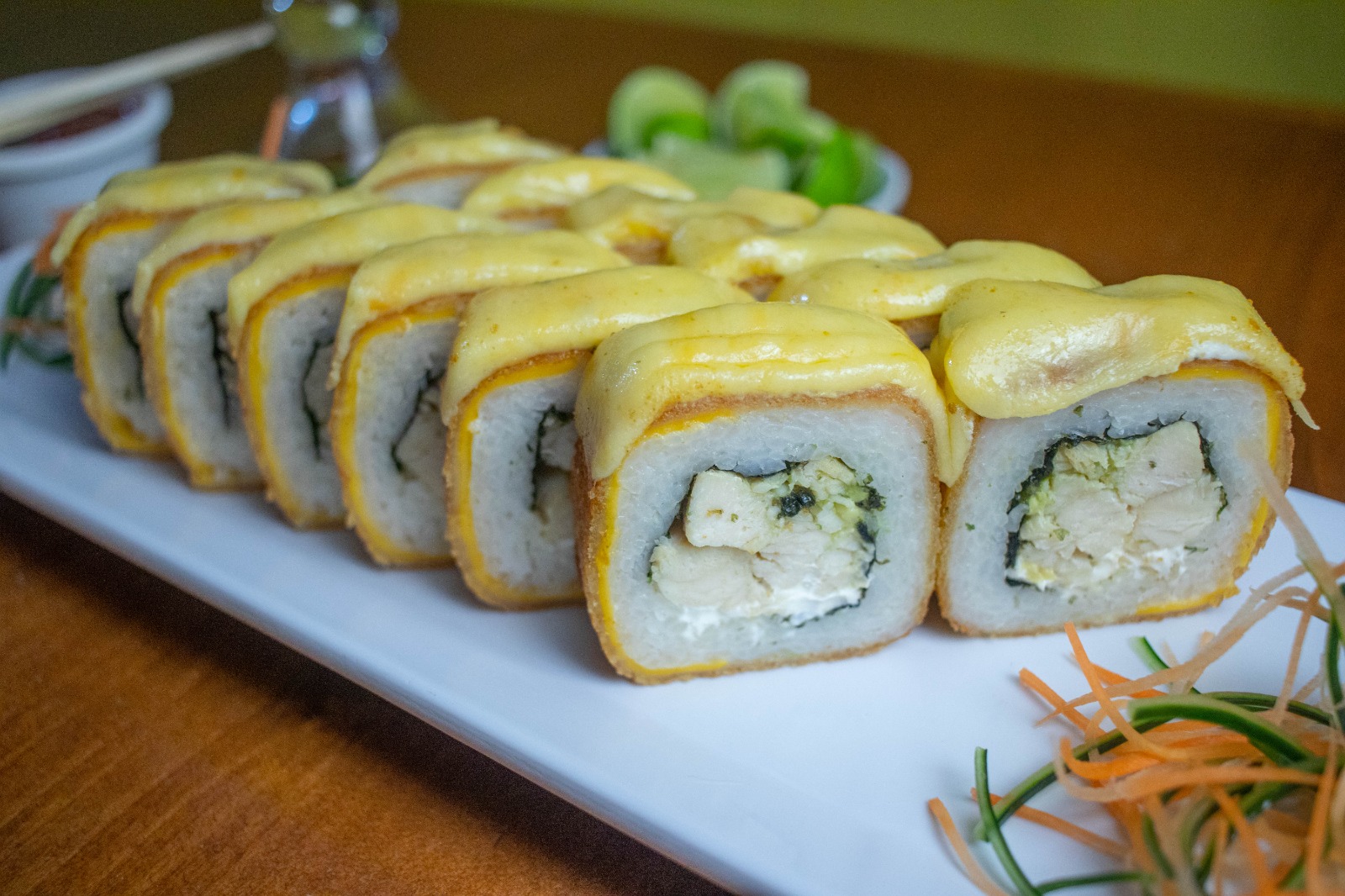 Philadelphia, aguacate y un ingrediente a escoger por dentro, queso americano y queso chihuahua gratinados por fuera, acompañado de zanahoria, cebollin, aderezo chipotle y soya.