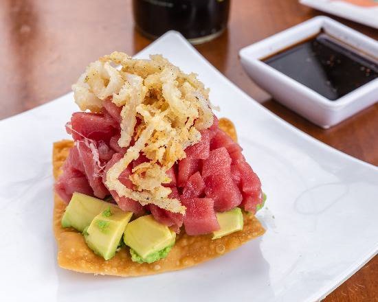 Atún picado en cuadritos bañados en salsas negras, montados sobre una tostada won ton con aguacate y con cebolla caramelizada encima.