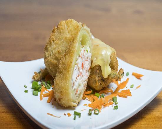 Surimi relleno de camarón y Philadelphia, empanizado con queso gratinados encima.