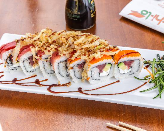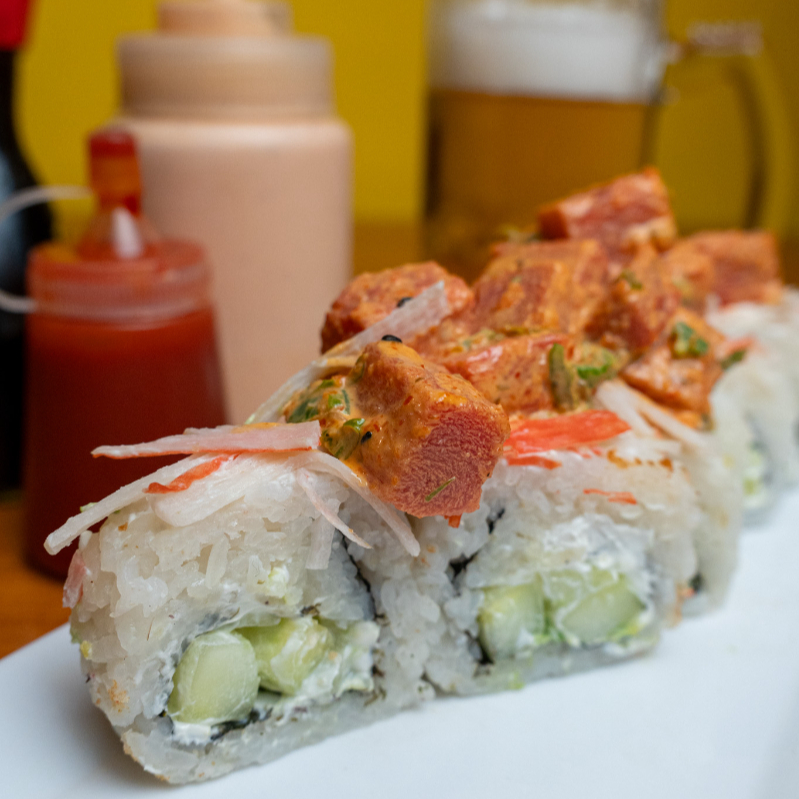 Philadelphia, aguacate y pepino por dentro con kanikama por fuera con topping de atún, chile serrano frito y aderezo spicy, acompañado de zanahoria, cebollin, aderezo chipotle y soya.